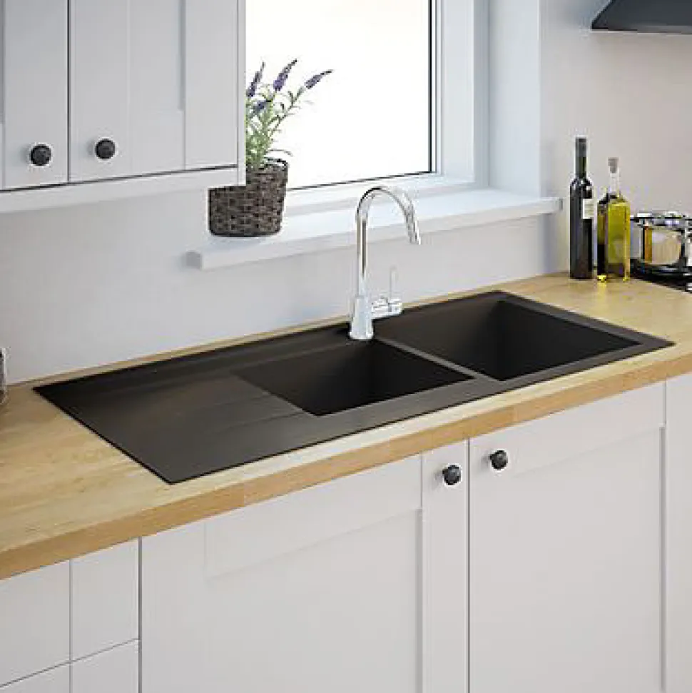 Elégance et modernité ne font plus qu’un avec cet évier noir à encastrer. Associé à un plan de travail en bois clair, il offre un rendu contemporain. Pratique, il propose un égouttoir et deux bacs, atout idéal pour les tâches quotidiennes comme la vaisselle ou la préparation des fruits et légumes.