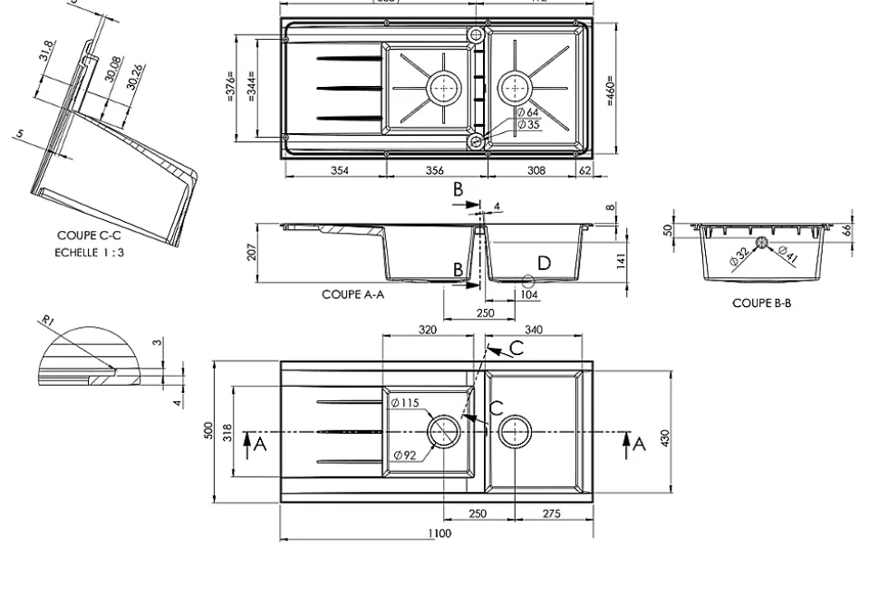 - Dimensions encastrement (cm) : L. 110 x P. 50