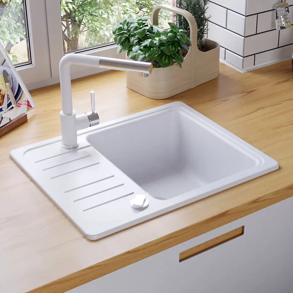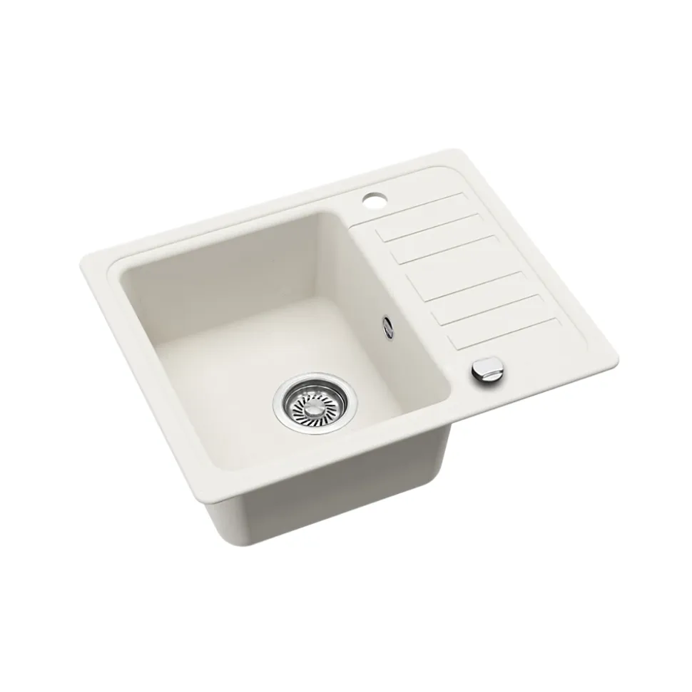 POINTS FORTS : • Évier encastrable 57,5×46 cm • • Meuble sous évier 45 cm minimum• • Evier vidage automatique • • Evier réversible CARACTÉRISTIQUES : • Équipements inclus : bonde(s), siphon, trop plein, tuyaux d’évacuation • Marque : Helika • Matériau : Granit • Type de pose : à encastrer • Positionnement égouttoir : réversible • Coloris : Blanc • Emplacement robinetterie : percé • Nombre de bacs : 1 bac • Poids net (Kg) : 14.0 • Trop plein : oui • Sous-meuble : 45 cm • Longueur (mm) : 575 • Largeur (mm) : 460 • Longueur d’encastrement (mm) : 555 • Largeur d’encastrement (mm) : 440 • Grande dimension cuve 1 (mm) : 390 • Petite dimension cuve 1 (mm) : 320 • Profondeur cuve 1 (mm) : 190 • Diamètre bonde cuve 1 (mm) : 90 • Grande dimension cuve 2 (mm) : non disponible • Petite dimension cuve 2 (mm) : non disponible • Profondeur cuve 2 (mm) : non disponible • Diamètre bonde cuve 2 (mm) : non disponible • Bon à savoir : ce produit ne présente pas de spécificités supplémentaires • Vidage : automatique • Référence vidage : le vidage est déjà inclus