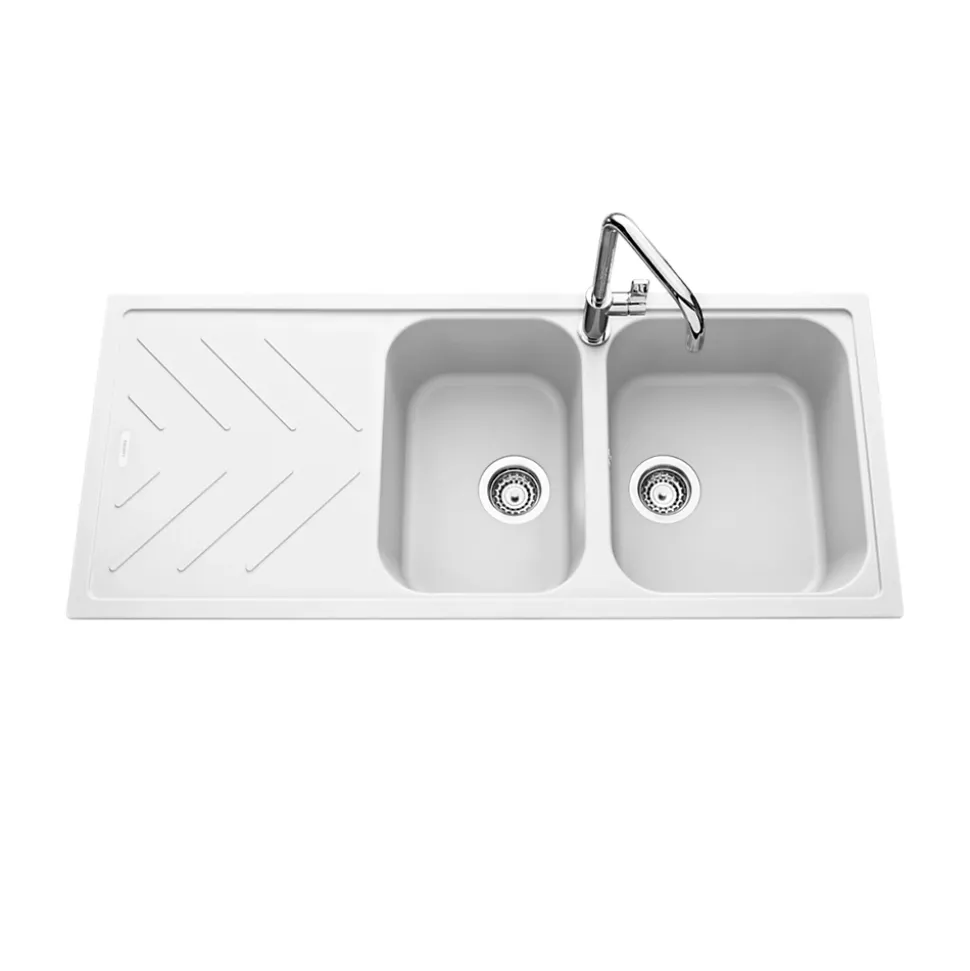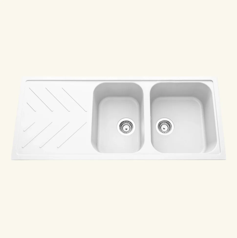 POINTS FORTS : • Évier encastrable 116×50 cm •• Meuble sous évier 80 cm minimum •• Evier vidage manuel •• Évier réversible CARACTÉRISTIQUES : • Équipements inclus : bonde(s), siphon, trop plein, tuyaux d’évacuation • Marque : Luisina • Matériau : Granit • Type de pose : à encastrer • Positionnement égouttoir : réversible • Coloris : Blanc • Emplacement robinetterie : pré-marqué • Nombre de bacs : 2 bacs • Poids net (Kg) : 17.34 • Trop plein : oui • Sous-meuble : 80 cm • Longueur (mm) : 1160 • Largeur (mm) : 500 • Longueur d’encastrement (mm) : 1140 • Largeur d’encastrement (mm) : 480 • Grande dimension cuve 1 (mm) : 424 • Petite dimension cuve 1 (mm) : 365 • Profondeur cuve 1 (mm) : 200 • Diamètre bonde cuve 1 (mm) : 90 • Grande dimension cuve 2 (mm) : 424 • Petite dimension cuve 2 (mm) : 295 • Profondeur cuve 2 (mm) : 200 • Diamètre bonde cuve 2 (mm) : 90 • Bon à savoir : ce produit ne présente pas de spécificités supplémentaires • Vidage : manuel • Référence vidage : le vidage est déjà inclus