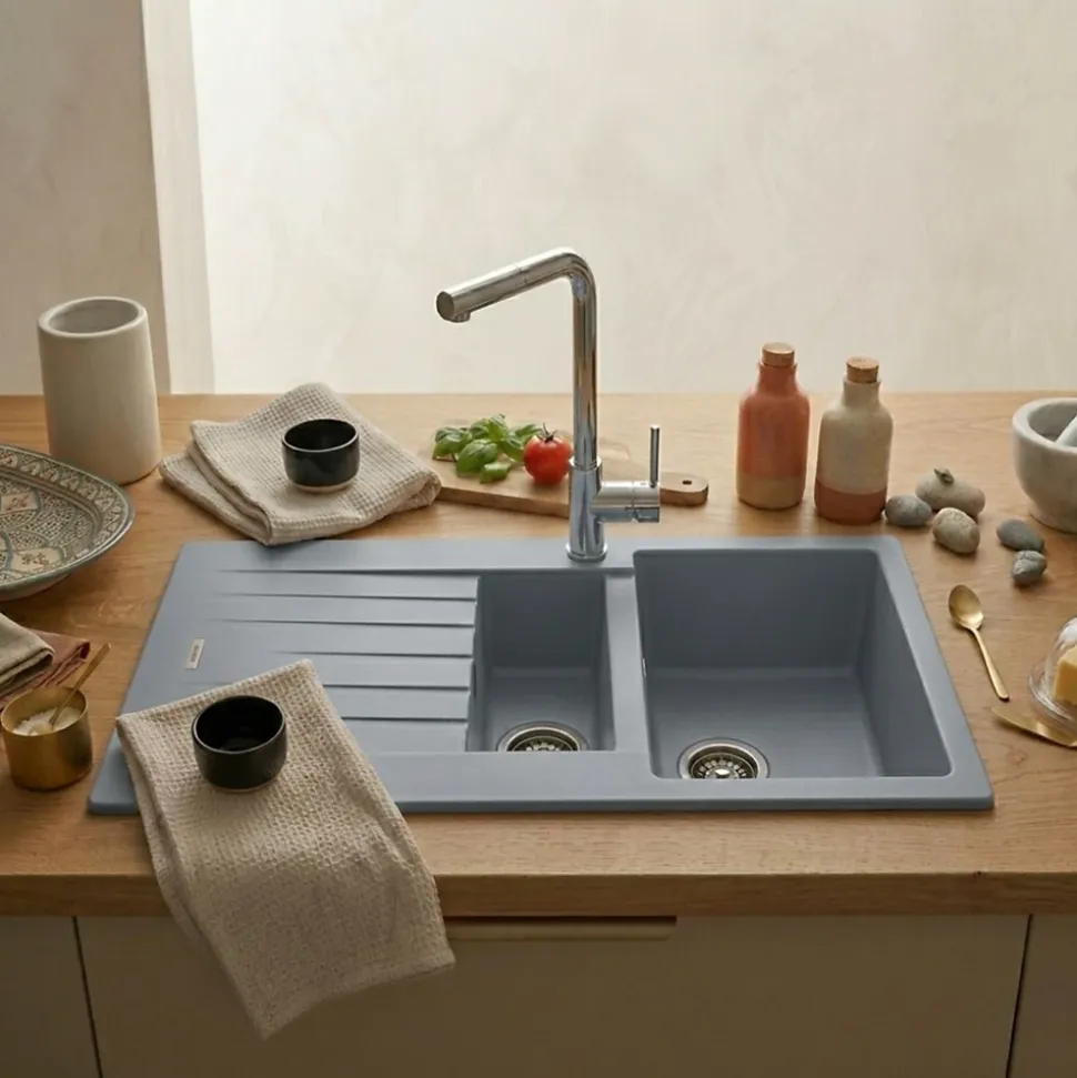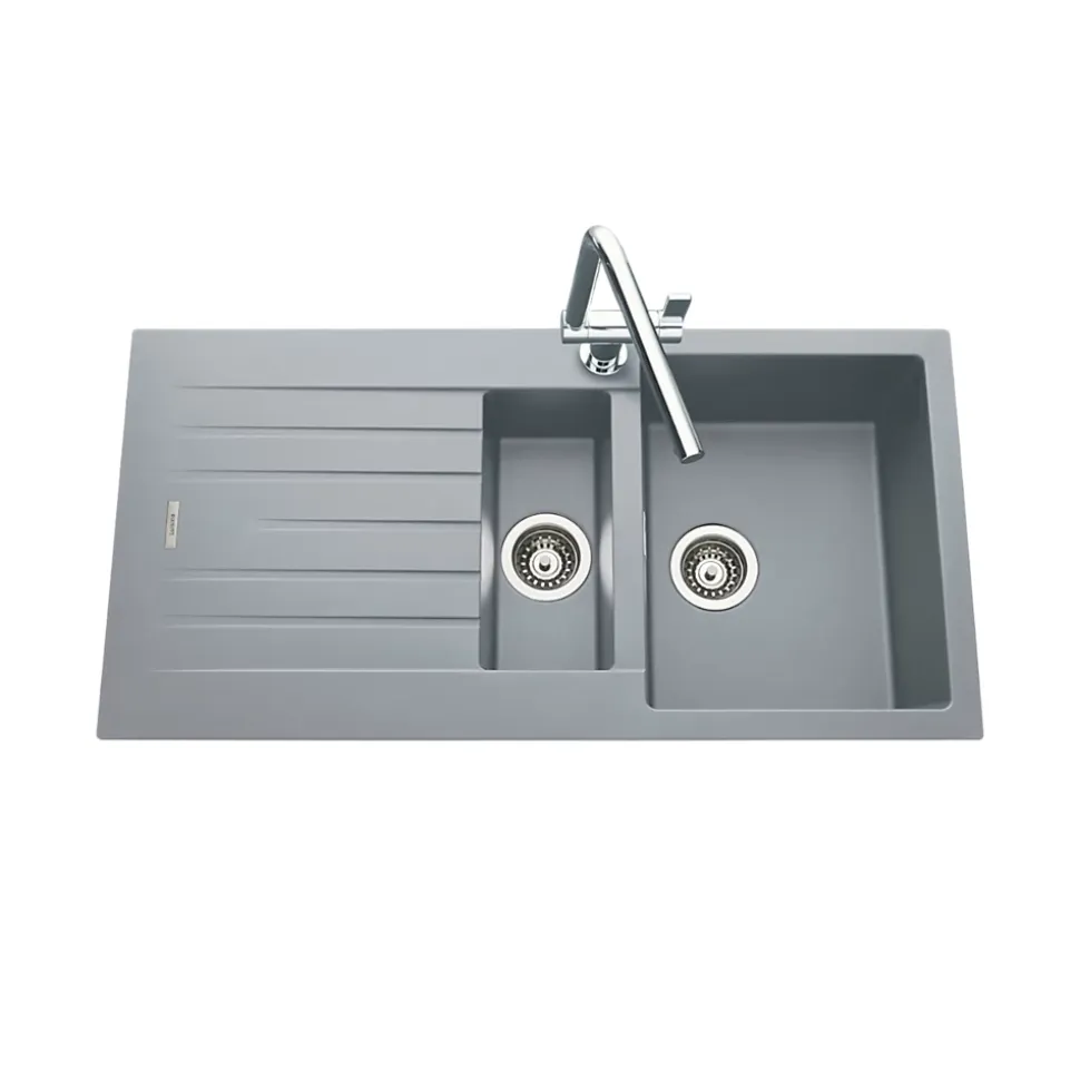 POINTS FORTS : • Évier encastrable 100×50 cm • • Meuble sous évier 60 cm minimum• • Evier vidage manuel • • Evier réversible CARACTÉRISTIQUES : • Équipements inclus : bonde(s), siphon, trop plein, tuyaux d’évacuation • Marque : Luisina • Matériau : Granit • Type de pose : à encastrer • Positionnement égouttoir : réversible • Coloris : Gris • Emplacement robinetterie : pré-marqué • Nombre de bacs : 1 bac 1/2 • Poids net (Kg) : 15.72 • Trop plein : oui • Sous-meuble : 60 cm • Longueur (mm) : 1000 • Largeur (mm) : 500 • Longueur d’encastrement (mm) : 980 • Largeur d’encastrement (mm) : 480 • Grande dimension cuve 1 (mm) : 430 • Petite dimension cuve 1 (mm) : 345 • Profondeur cuve 1 (mm) : 200 • Diamètre bonde cuve 1 (mm) : 90 • Grande dimension cuve 2 (mm) : 340 • Petite dimension cuve 2 (mm) : 155 • Profondeur cuve 2 (mm) : 90 • Diamètre bonde cuve 2 (mm) : 90 • Bon à savoir : ce produit ne présente pas de spécificités supplémentaires • Vidage : manuel • Référence vidage : le vidage est déjà inclus