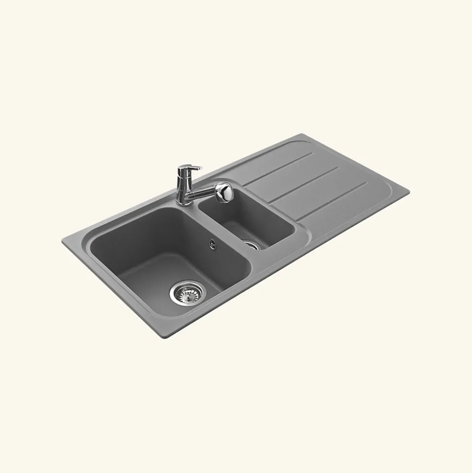POINTS FORTS : • Évier encastrable 100×50 cm • • Evier vidage manuel • • Meuble sous évier 60 cm minimum • • Évier réversible CARACTÉRISTIQUES : • Équipements inclus : bonde(s), siphon, trop plein, tuyaux d’évacuation • Marque : Ewi • Matériau : Granit • Type de pose : à encastrer • Positionnement égouttoir : réversible • Coloris : Gris • Emplacement robinetterie : pré-marqué • Nombre de bacs : 1 bac 1/2 • Poids net (Kg) : 13.9 • Trop plein : oui • Sous-meuble : 60 cm • Longueur (mm) : 1000 • Largeur (mm) : 500 • Longueur d’encastrement (mm) : 984 • Largeur d’encastrement (mm) : 484 • Grande dimension cuve 1 (mm) : 410 • Petite dimension cuve 1 (mm) : 320 • Profondeur cuve 1 (mm) : 207 • Diamètre bonde cuve 1 (mm) : 90 • Grande dimension cuve 2 (mm) : 300 • Petite dimension cuve 2 (mm) : 168 • Profondeur cuve 2 (mm) : 162 • Diamètre bonde cuve 2 (mm) : 90 • Bon à savoir : ce produit ne présente pas de spécificités supplémentaires • Vidage : manuel • Référence vidage : le vidage est déjà inclus
