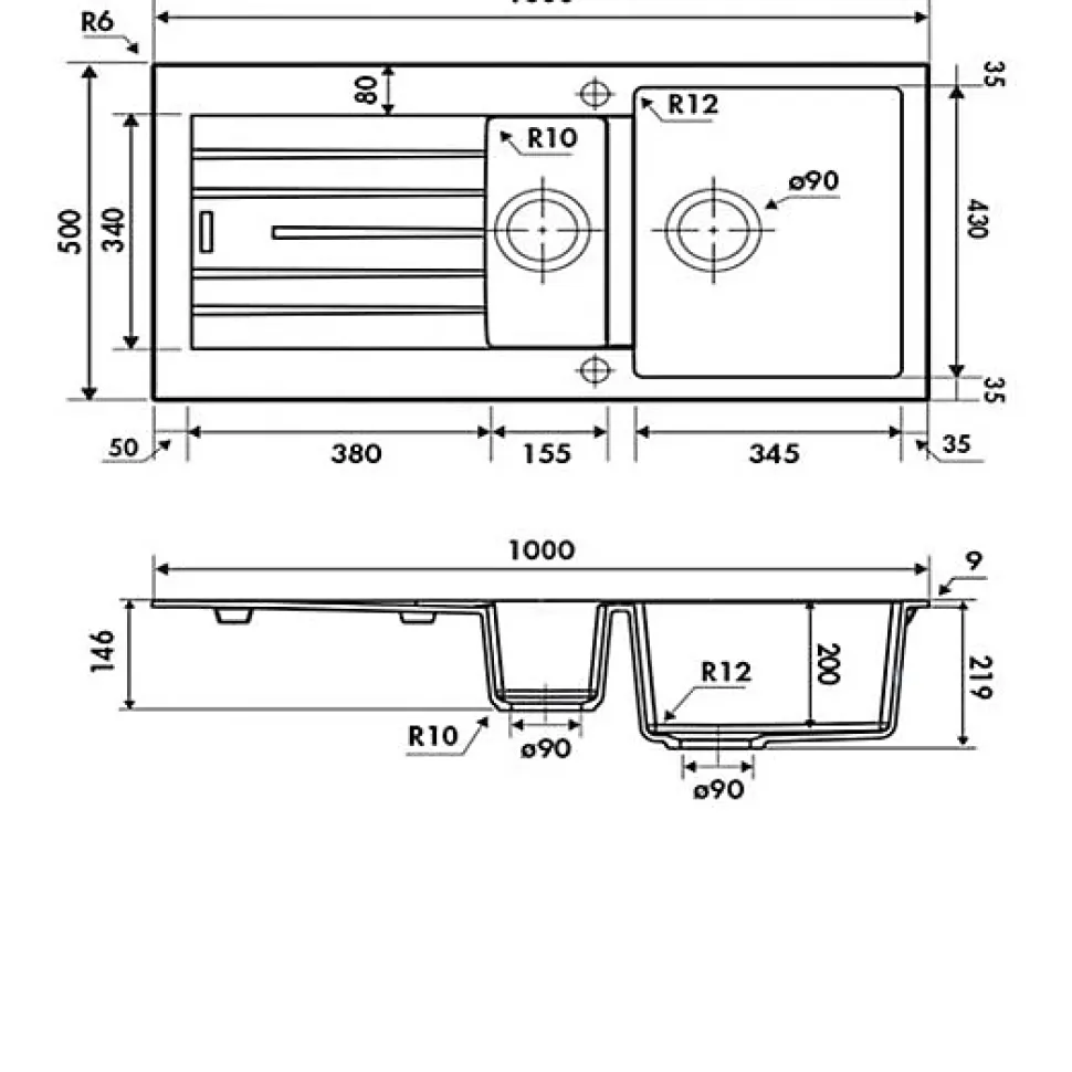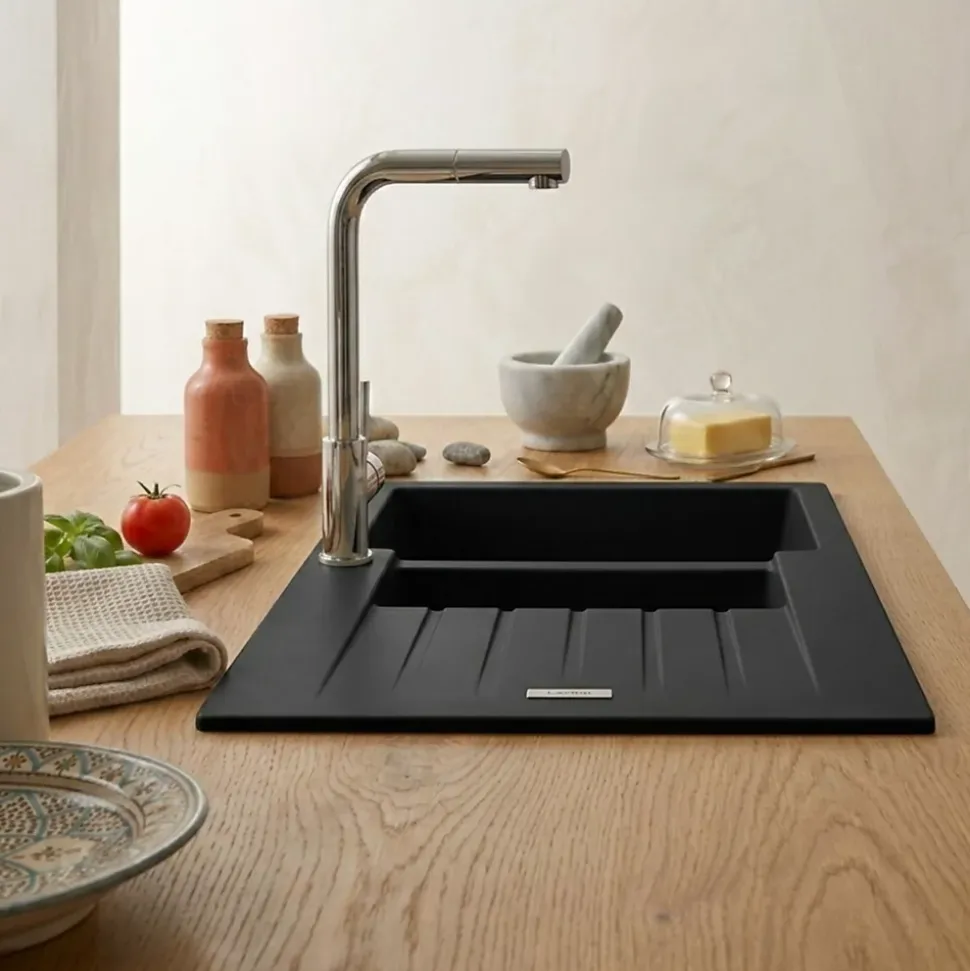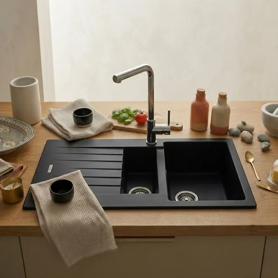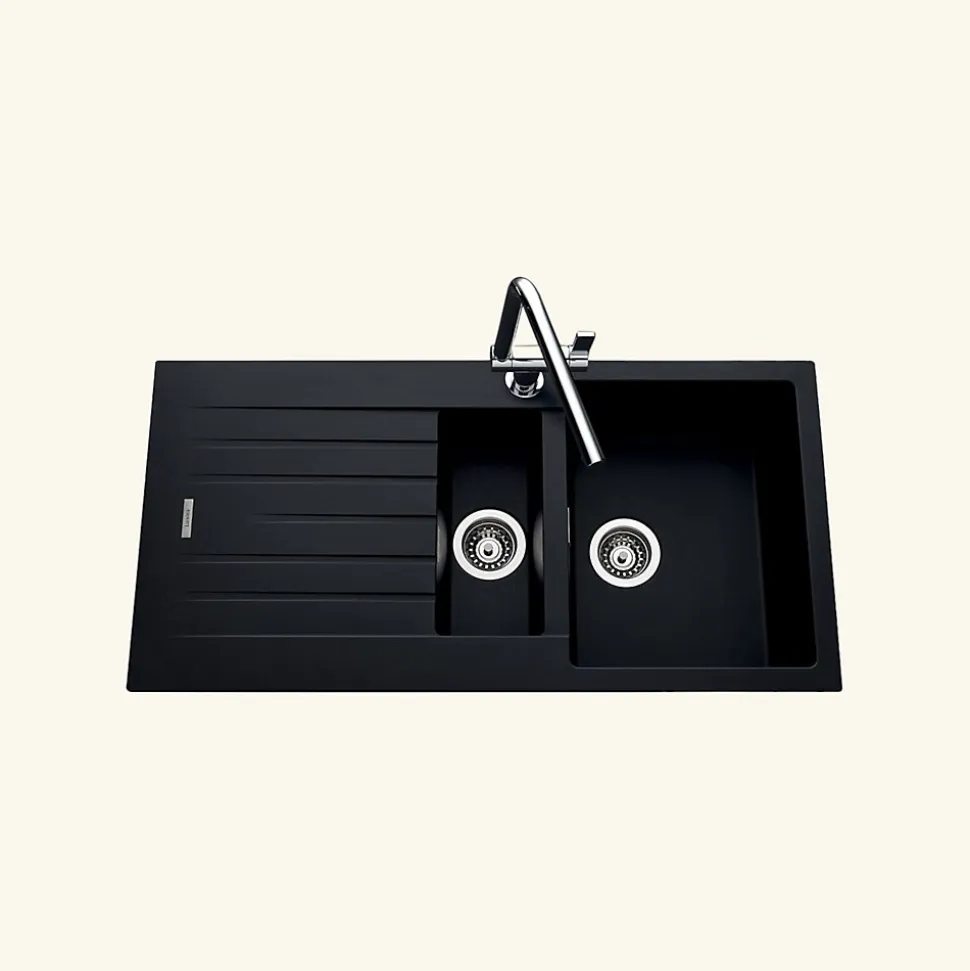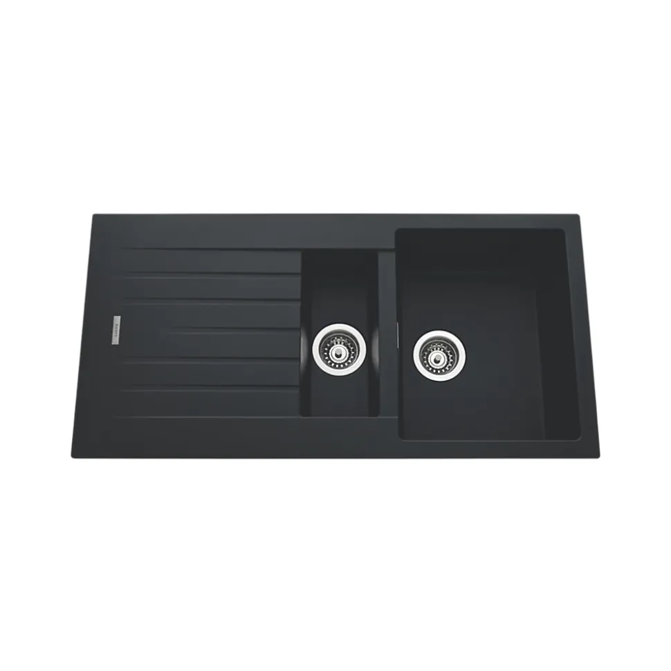 POINTS FORTS : • Évier encastrable 100×50 cm • • Meuble sous évier 60 cm minimum• • Evier vidage manuel • • Evier réversible CARACTÉRISTIQUES : • Équipements inclus : bonde(s), siphon, trop plein, tuyaux d’évacuation • Marque : Luisina • Matériau : Granit • Type de pose : à encastrer • Positionnement égouttoir : réversible • Coloris : Noir • Emplacement robinetterie : pré-marqué • Nombre de bacs : 1 bac 1/2 • Poids net (Kg) : 15.72 • Trop plein : oui • Sous-meuble : 60 cm • Longueur (mm) : 1000 • Largeur (mm) : 500 • Longueur d’encastrement (mm) : 980 • Largeur d’encastrement (mm) : 480 • Grande dimension cuve 1 (mm) : 430 • Petite dimension cuve 1 (mm) : 345 • Profondeur cuve 1 (mm) : 200 • Diamètre bonde cuve 1 (mm) : 90 • Grande dimension cuve 2 (mm) : 340 • Petite dimension cuve 2 (mm) : 155 • Profondeur cuve 2 (mm) : 90 • Diamètre bonde cuve 2 (mm) : 90 • Bon à savoir : ce produit ne présente pas de spécificités supplémentaires • Vidage : manuel • Référence vidage : le vidage est déjà inclus