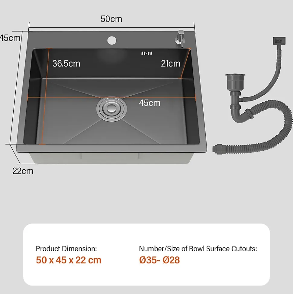 Description du produit:Spécifications du produit :Couleur : Gris MétalliséMatériau : Acier inoxydable Dimensions du produit: 50 x 45 x 22 cmDimensions de l’emballage: 55 x 50 x 26 cmPoids brut : 6.3 kgPoids net : 5.5 kgLe kit comprend :1 x Évier (Cuvette principale)1 x Distributeur de savon métallique1 x Kit d’évacuation complet1 x Notice d’installation