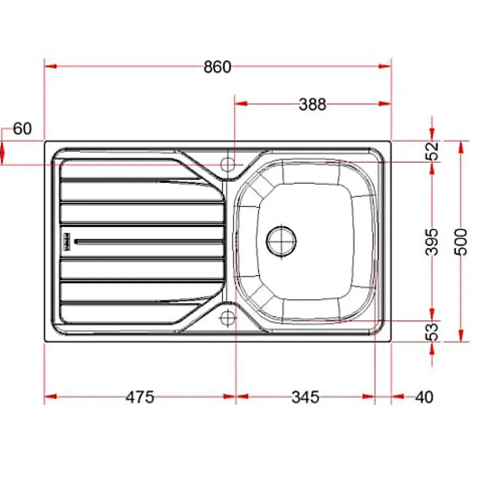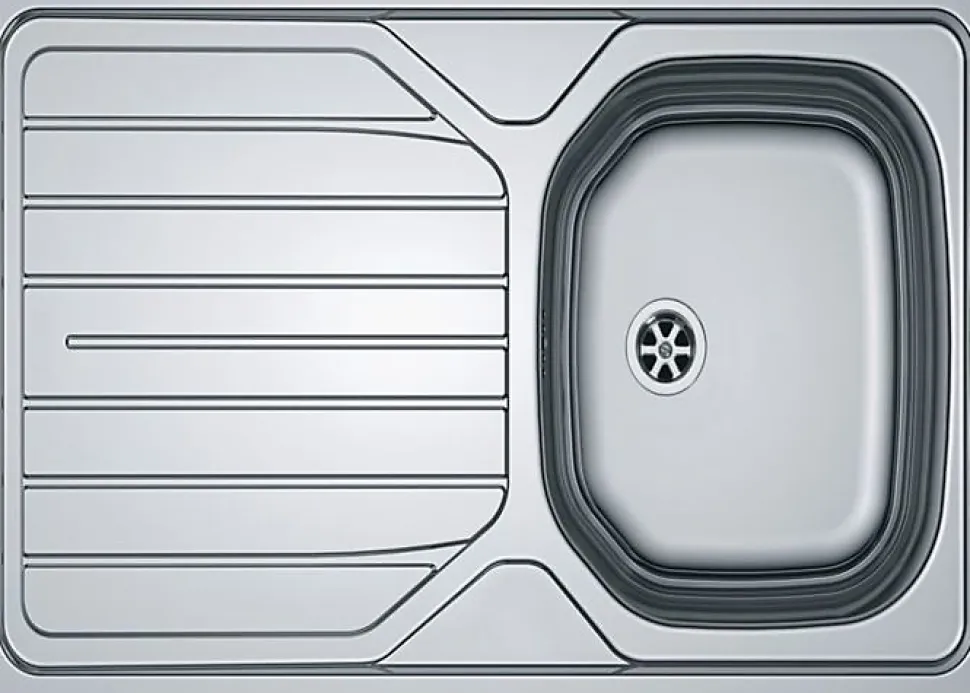 Évier Franke RENOVA en acier inoxydable brossé/poli, 860 x 500 mm, 1 bac avec égouttoir réversible, vidage 70 mm et trop-plein, kit de vidage manuel fourni, non pré-percé pour robinet, design arrondi et rainures intégrées pour un entretien facile.