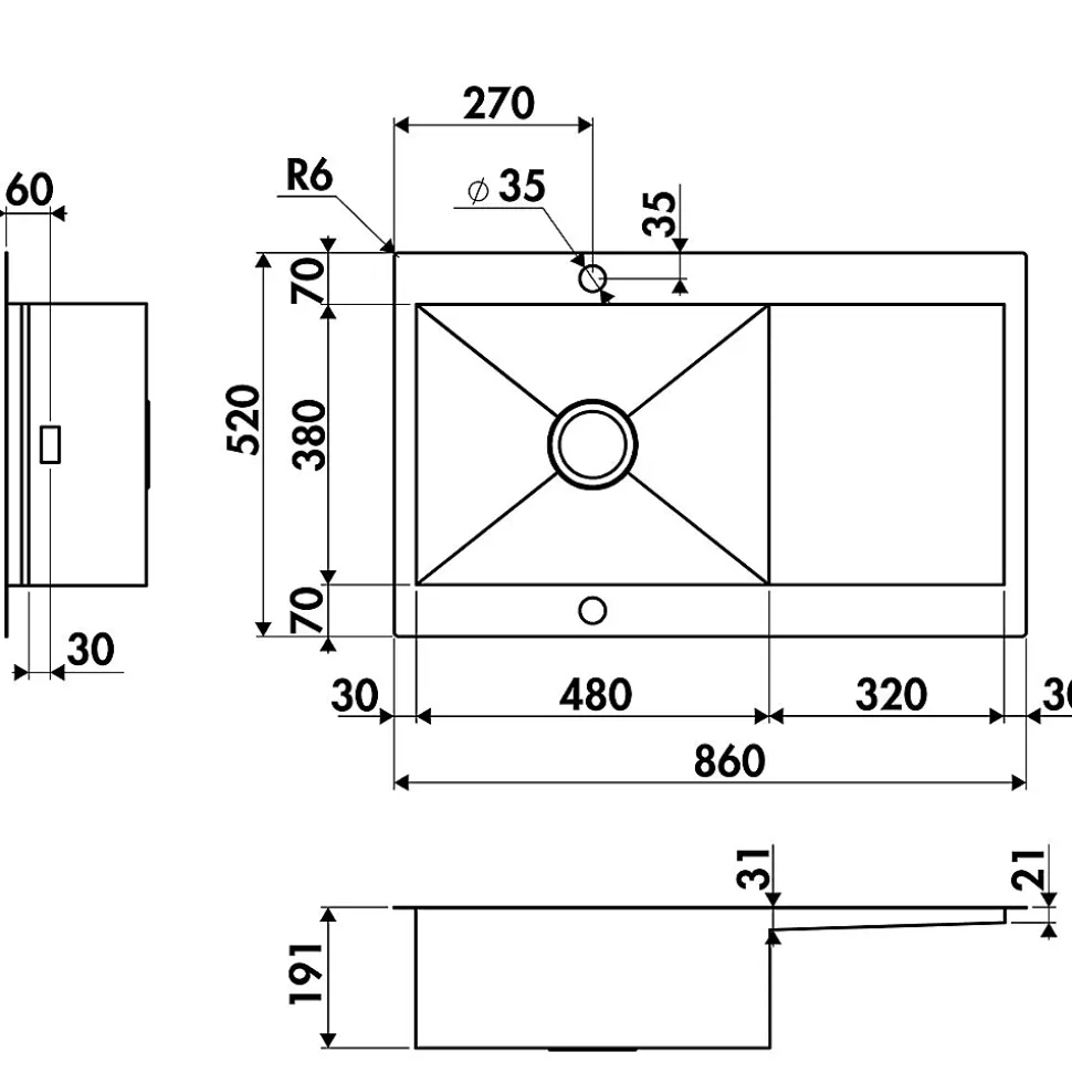 POINTS FORTS : • Évier encastrable 86×52 cm •• Meuble sous évier 60 cm minimum•• Evier vidage automatique •• Évier réversible CARACTÉRISTIQUES : • Équipements inclus : bonde(s), siphon, trop plein, tuyaux d’évacuation • Marque : sans marque • Matériau : Inox • Type de pose : à encastrer • Positionnement égouttoir : réversible • Coloris : Inox • Emplacement robinetterie : percé • Nombre de bacs : 1 bac • Poids net (Kg) : 10.14 • Trop plein : oui • Sous-meuble : 60 cm • Longueur (mm) : 860 • Largeur (mm) : 520 • Longueur d’encastrement (mm) : 850 • Largeur d’encastrement (mm) : 510 • Grande dimension cuve 1 (mm) : 480 • Petite dimension cuve 1 (mm) : 380 • Profondeur cuve 1 (mm) : 191 • Diamètre bonde cuve 1 (mm) : 90 • Grande dimension cuve 2 (mm) : non disponible • Petite dimension cuve 2 (mm) : non disponible • Profondeur cuve 2 (mm) : non disponible • Diamètre bonde cuve 2 (mm) : non disponible • Bon à savoir : ce produit ne présente pas de spécificités supplémentaires • Vidage : automatique • Référence vidage : le vidage est déjà inclus
