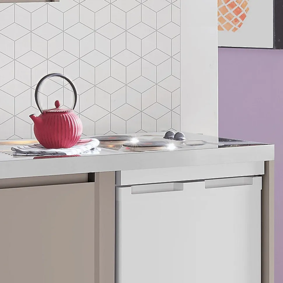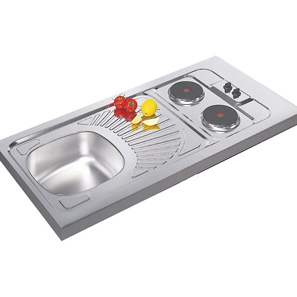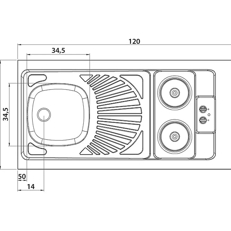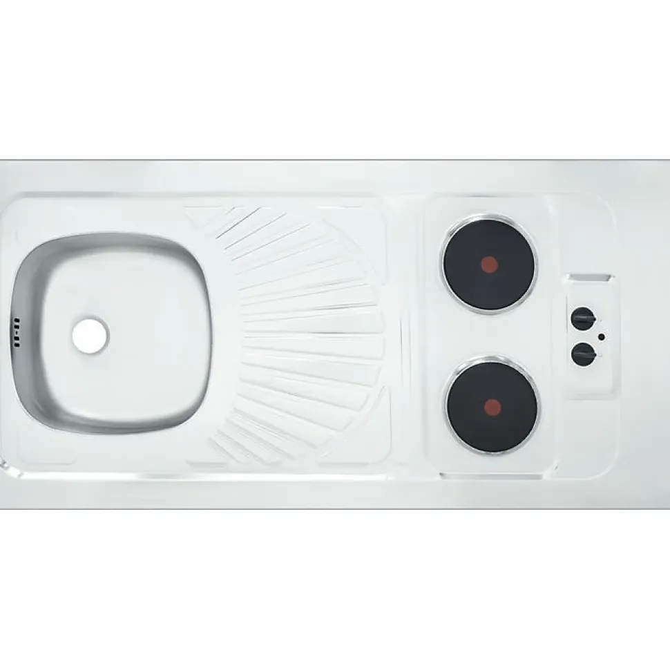 Idéal pour les kitchenettes, cuisinettes, et petits espaces Compatible avec tous les meubles Démontage / Remontage rapide des plaques de cuisson Evier à poser inox 18/10 – Nettoyage facile Vidage complet avec raccord lave-vaisselle Dimension : 120 x 60