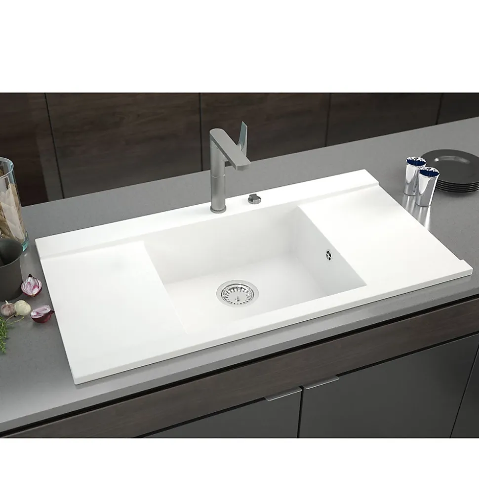 POINTS FORTS : CARACTÉRISTIQUES : • Équipements inclus : livré sans équipement • Marque : Kümbad • Matériau : Granit • Type de pose : à encastrer • Positionnement égouttoir : double • Coloris : Blanc • Emplacement robinetterie : pré-marqué • Nombre de bacs : 1 bac • Poids net (Kg) : 15.0 • Trop plein : oui • Sous-meuble : 50 cm • Longueur (mm) : 960 • Largeur (mm) : 510 • Longueur d’encastrement (mm) : 940 • Largeur d’encastrement (mm) : 490 • Grande dimension cuve 1 (mm) : 450 • Petite dimension cuve 1 (mm) : 390 • Profondeur cuve 1 (mm) : 180 • Diamètre bonde cuve 1 (mm) : 90 • Grande dimension cuve 2 (mm) : non disponible • Petite dimension cuve 2 (mm) : non disponible • Profondeur cuve 2 (mm) : non disponible • Diamètre bonde cuve 2 (mm) : non disponible • Bon à savoir : ce produit ne présente pas de spécificités supplémentaires • Vidage : manuel • Référence vidage : à commander séparémment