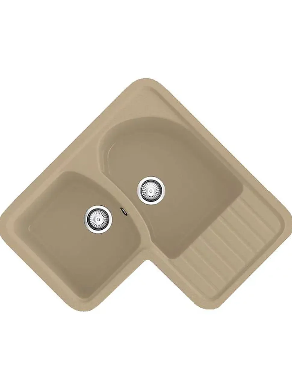 Evier d’angle à installation sur plan (à encastrer) avec deux cuves et un égouttoirInclus : une bonde ronde.Résistance à l’impact : 12 kgf/m2Résistance à la compression : 1595 kgf/m2Résistance à la flexion : 5110 MPARésistance thermique : 130 oCDureté Barcol (935) : 45Résistance aux tâchesAvec des détergents : Pas de changementAvec des produits anticalcaires : Pas de changement