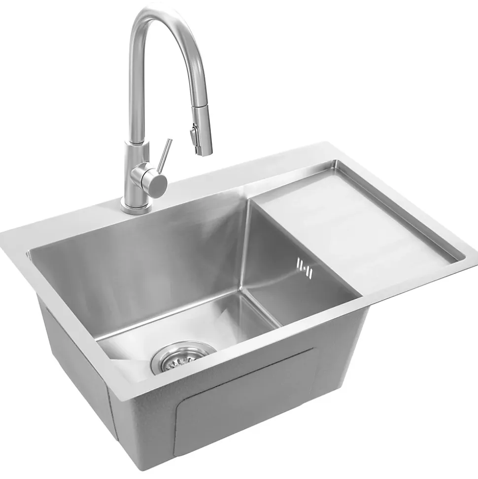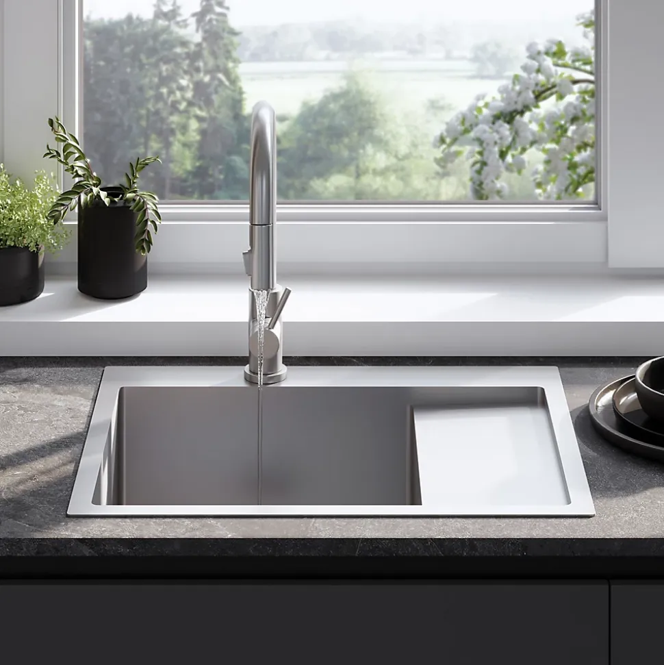 Avec son look minimaliste et moderne, l’évier de cuisine avec robinet mitigeur s’intégrera dans le design de n’importe quelle cuisine. Complété par un mitigeur à bec flexible, il crée un poste de travail complet dans la zone humide. Le produit est doté d’une bonde à la teinte assortie, ce qui confère à l’ensemble un aspect très cohérent et élégant. Le siphon, fourni avec l’évier, est un modèle pratique qui permet d’économiser de l’espace. Grâce à la disposition du tuyau d’évacuation, il est possible de créer un espace de rangement supplémentaire dans le placard sous l’évier pour les paquets de détergents ou les poubelles. Le matériau hygiénique et la facilité de nettoyage des surfaces lisses donnent à l’évier un aspect impeccable et empêchent la prolifération microbienne.