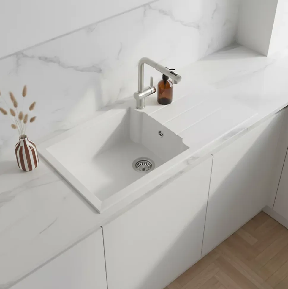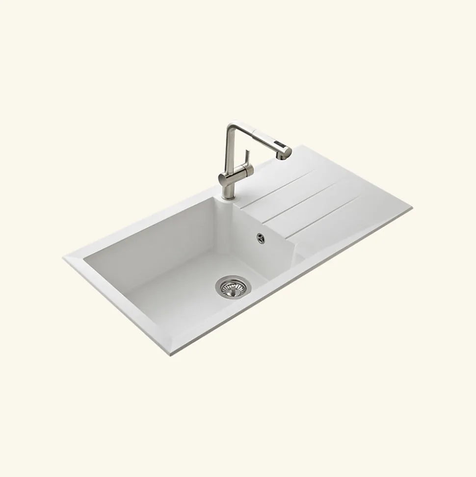 POINTS FORTS : • Évier encastrable 100×50 cm •• Meuble sous évier 60 cm minimum •• Evier vidage manuel •• Évier réversible fabriqué en France CARACTÉRISTIQUES : • Équipements inclus : bonde(s), siphon, trop plein, tuyaux d’évacuation • Marque : Kümbad • Matériau : Résine • Type de pose : à encastrer • Positionnement égouttoir : réversible • Coloris : Blanc • Emplacement robinetterie : non percé • Nombre de bacs : 1 bac • Poids net (Kg) : 9.8 • Trop plein : oui • Sous-meuble : 60 cm • Longueur (mm) : 1000 • Largeur (mm) : 500 • Longueur d’encastrement (mm) : 980 • Largeur d’encastrement (mm) : 480 • Grande dimension cuve 1 (mm) : 526 • Petite dimension cuve 1 (mm) : 420 • Profondeur cuve 1 (mm) : 210 • Diamètre bonde cuve 1 (mm) : 90 • Grande dimension cuve 2 (mm) : non disponible • Petite dimension cuve 2 (mm) : non disponible • Profondeur cuve 2 (mm) : non disponible • Diamètre bonde cuve 2 (mm) : non disponible • Bon à savoir : ce produit ne présente pas de spécificités supplémentaires • Vidage : manuel • Référence vidage : le vidage est déjà inclus