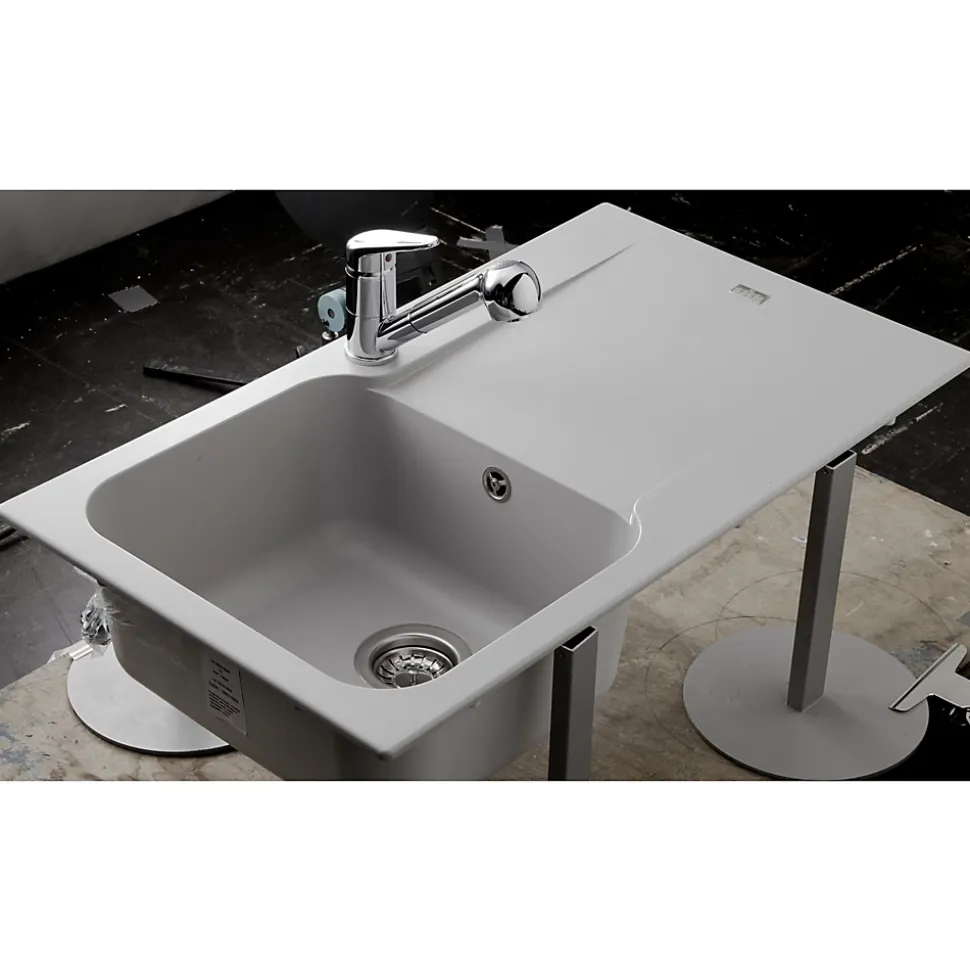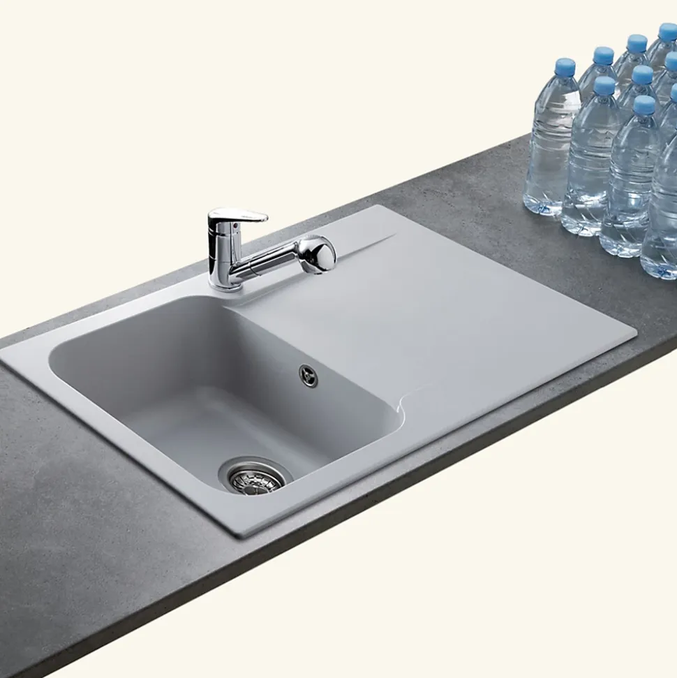 POINTS FORTS : • Évier encastrable 86×50 cm •• Meuble sous évier 45 cm minimum •• Evier vidage manuel •• Évier réversible CARACTÉRISTIQUES : • Équipements inclus : bonde(s), siphon, trop plein, tuyaux d’évacuation • Marque : Ewi • Matériau : Résine • Type de pose : à encastrer • Positionnement égouttoir : réversible • Coloris : Gris • Emplacement robinetterie : non percé • Nombre de bacs : 1 bac • Poids net (Kg) : 5.6 • Trop plein : oui • Sous-meuble : 45 cm • Longueur (mm) : 860 • Largeur (mm) : 500 • Longueur d’encastrement (mm) : 836 • Largeur d’encastrement (mm) : 472 • Grande dimension cuve 1 (mm) : 420 • Petite dimension cuve 1 (mm) : 365 • Profondeur cuve 1 (mm) : 210 • Diamètre bonde cuve 1 (mm) : 90 • Grande dimension cuve 2 (mm) : non disponible • Petite dimension cuve 2 (mm) : non disponible • Profondeur cuve 2 (mm) : non disponible • Diamètre bonde cuve 2 (mm) : non disponible • Bon à savoir : ce produit ne présente pas de spécificités supplémentaires • Vidage : manuel • Référence vidage : le vidage est déjà inclus