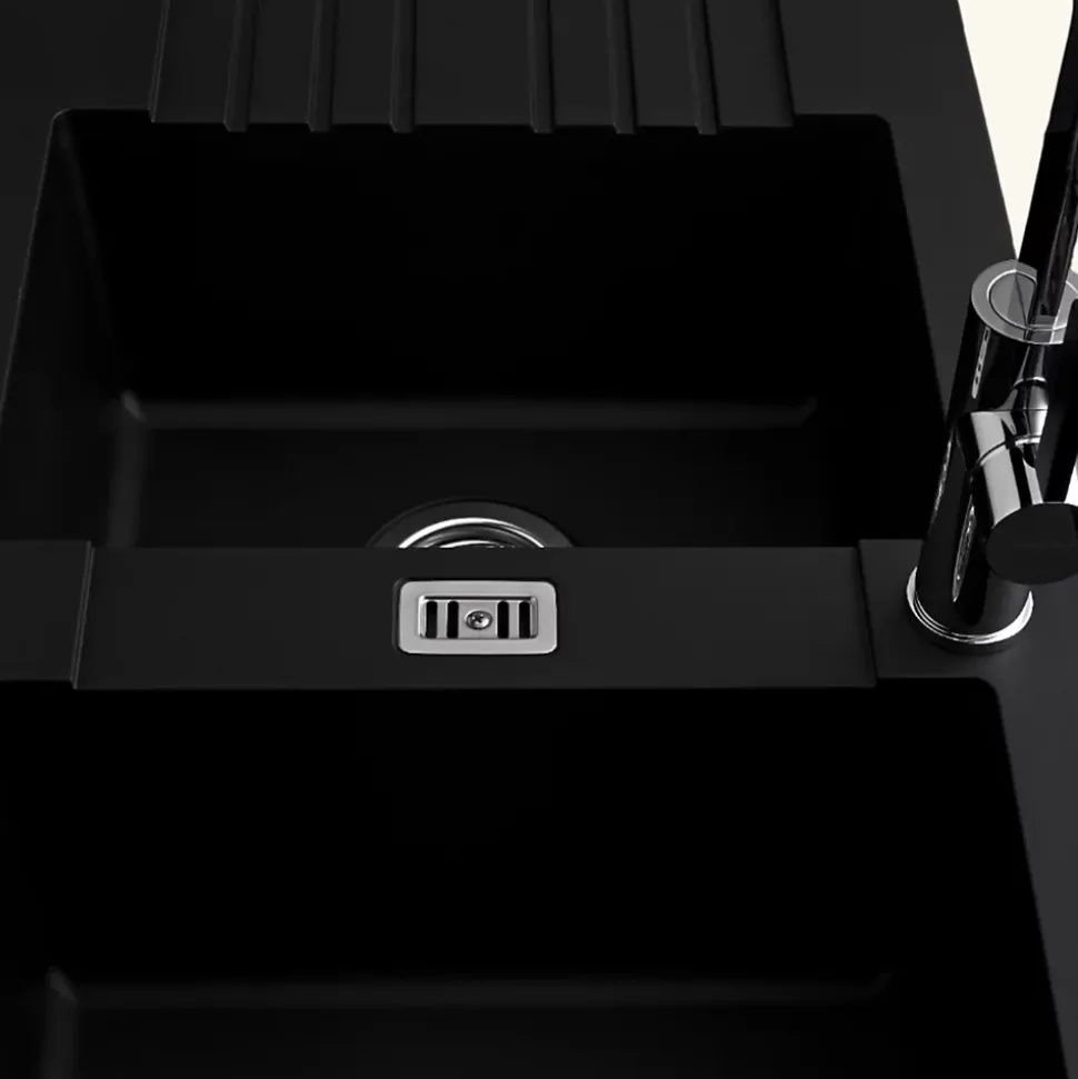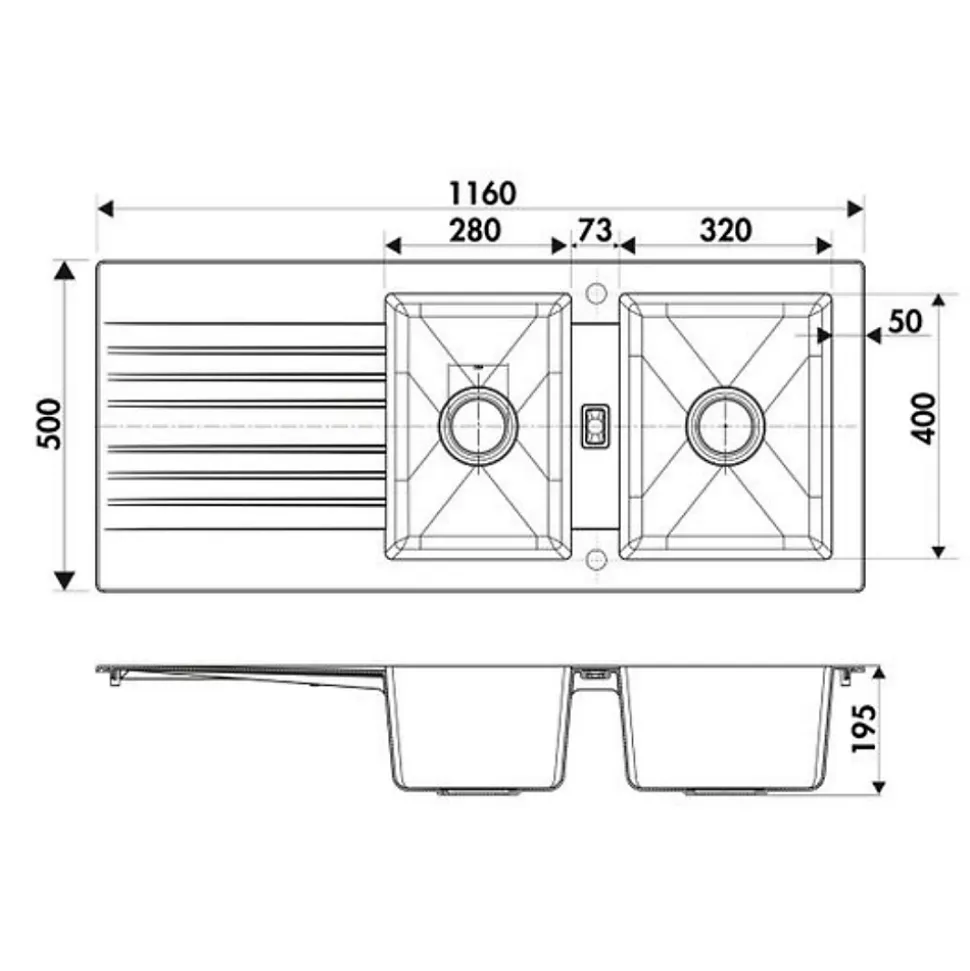 POINTS FORTS : • Évier encastrable 116×50 cm • • Meuble sous évier 80 cm minimum • • Evier vidage manuel • • Évier réversible CARACTÉRISTIQUES : • Équipements inclus : bonde(s), siphon, trop plein, tuyaux d’évacuation • Marque : sans marque • Matériau : Résine • Type de pose : à encastrer • Positionnement égouttoir : réversible • Coloris : Noir • Emplacement robinetterie : non percé • Nombre de bacs : 2 bacs • Poids net (Kg) : 8.78 • Trop plein : oui • Sous-meuble : 80 cm • Longueur (mm) : 1160 • Largeur (mm) : 500 • Longueur d’encastrement (mm) : 1140 • Largeur d’encastrement (mm) : 480 • Grande dimension cuve 1 (mm) : 400 • Petite dimension cuve 1 (mm) : 320 • Profondeur cuve 1 (mm) : 195 • Diamètre bonde cuve 1 (mm) : 90 • Grande dimension cuve 2 (mm) : 400 • Petite dimension cuve 2 (mm) : 280 • Profondeur cuve 2 (mm) : 2195 • Diamètre bonde cuve 2 (mm) : 90 • Bon à savoir : ce produit ne présente pas de spécificités supplémentaires • Vidage : manuel • Référence vidage : le vidage est déjà inclus