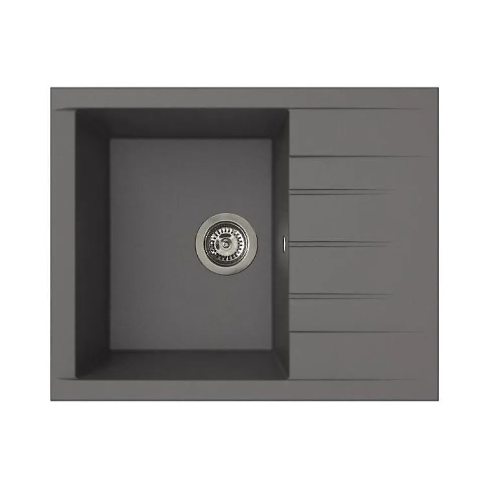 - Évier compact 1 bac en résine SMC, idéal pour petites cuisines ; finition gris béton mate, design cube moderne.