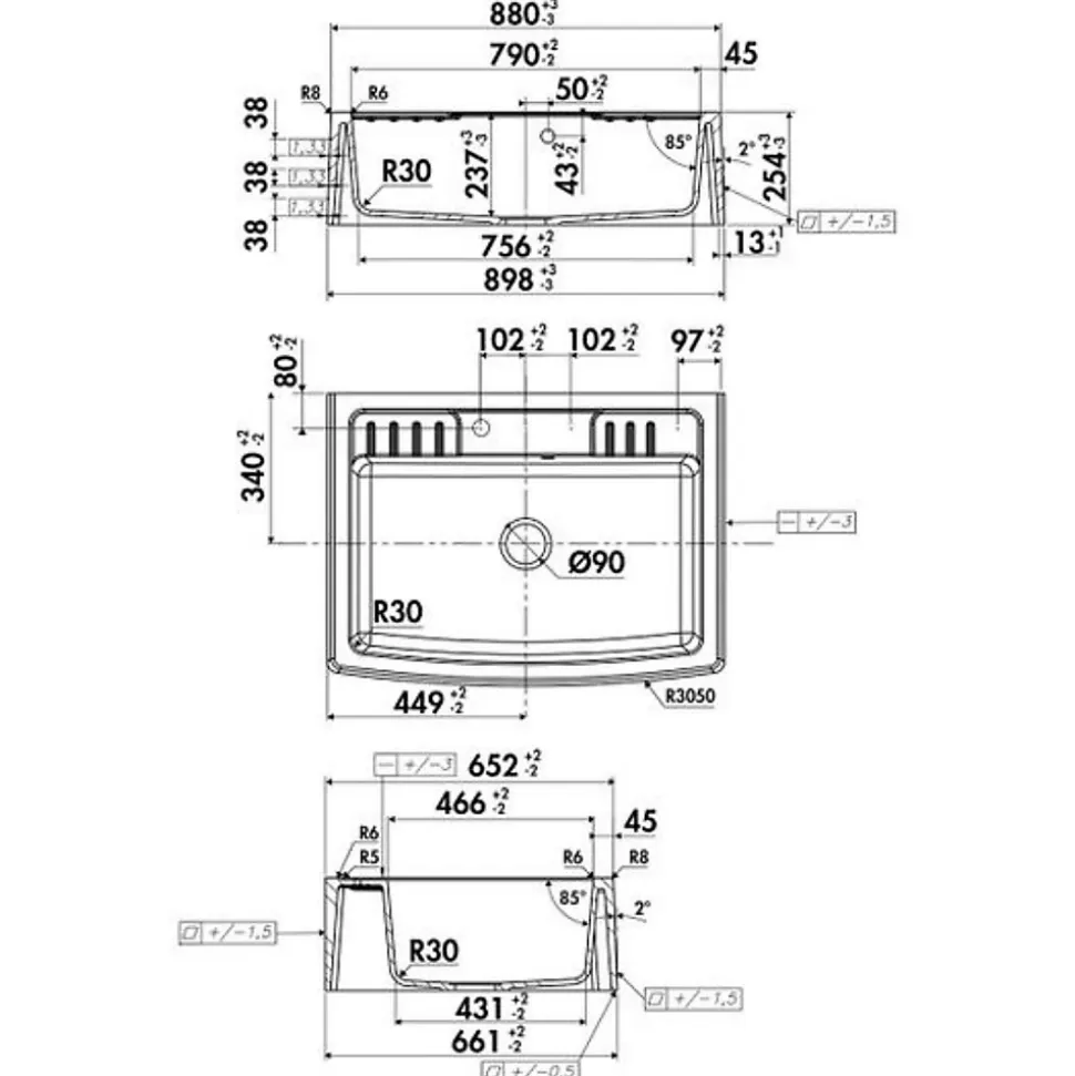 POINTS FORTS : • Évier timbre 89×66 cm • • Convient à un meuble sous évier de 90 cm• • Evier vidage manuel • • Evier sans égouttoir CARACTÉRISTIQUES : • Équipements inclus : bonde(s), siphon, trop plein, tuyaux d’évacuation • Marque : Chambord • Matériau : Granit • Type de pose : à poser • Positionnement égouttoir : sans égouttoir • Coloris : Noir • Emplacement robinetterie : percé • Nombre de bacs : 1 bac • Poids net (Kg) : 41.5 • Trop plein : oui • Sous-meuble : 90 cm • Longueur (mm) : 898 (+/-3 mm) • Largeur (mm) : 661 (+/-2 mm) • Longueur d’encastrement (mm) : non disponible • Largeur d’encastrement (mm) : • Grande dimension cuve 1 (mm) : 790 (+/-2) • Petite dimension cuve 1 (mm) : 466 (+/-2) • Profondeur cuve 1 (mm) : 254 (+/-3 mm) • Diamètre bonde cuve 1 (mm) : 90 • Grande dimension cuve 2 (mm) : non disponible • Petite dimension cuve 2 (mm) : non disponible • Profondeur cuve 2 (mm) : non disponible • Diamètre bonde cuve 2 (mm) : non disponible • Bon à savoir : ce produit ne présente pas de spécificités supplémentaires • Vidage : manuel • Référence vidage : le vidage est déjà inclus