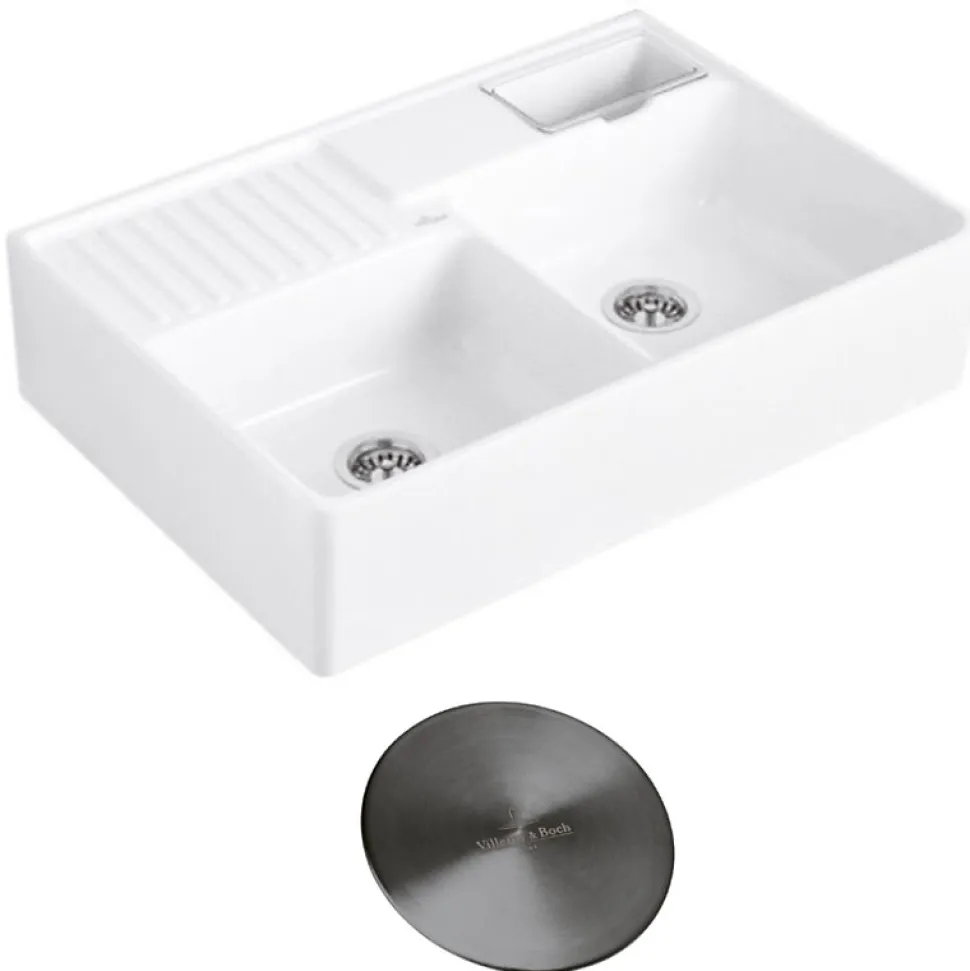 Evier timbre d’office VILLEROY ET BOCH Tradition 2 bacs 89,5 x 63 céramique vidage manuel blanc + Cache bonde anthracite