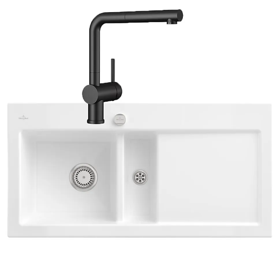 Points forts de l’évier 1 cuve 1/2 Subway Pure 60Design épuréÉviers en céramique de haute qualité composés de matières premières 100 %sMatières premières 100 %sExcellente résistance aux chocs et aux rayures et très faible risque de détériorationSurfaces parfaitement étanches pour un nettoyage facile et des surfaces hygiéniquesCaractéristiques de l’évier 1 cuve 1/2 Subway Pure 60Évier à encastrer par-dessusCéramiqueEgouttoir à droiteÉvier non réversible1 Cuve 1/2Dimensions : 100 x 51 cmDécoupe du plan de travail : 97 x 48 cmDimension minimale du meuble sous évier: 60 cm2 trous percésAvec vidage automatique (cet évier n’existe pas avec vidage manuel)Les avantages du Robinet cuisine VILLEROY ET BOCH Steel ShowerHauteur offrant une liberté de mouvement, condition parfaite pour faciliter le nettoyage et remplir de grand récipientsJet confort : jet ventilé parfaitement calibré pour économiser de l’eau sans aucune perte de confortPivotement complet à 360° pour une flexibilité totale sur l’évierRevêtement anti-traces et anti-tachesInstallation simple et rapide grâce à des composants de haute qualité et standardisésRobinet de cuisine en acier inoxydable 100% exempt d’acide, de goût et d’émissions pour un robinet robuste, durable, extrêmement hygiéniqueDesign moderne pour sublimer votre cuisineRevêtement PVD : la surface est résistante aux UV et aux chocsBouton switch pour changer facilement de jetCaractéristiques techniques du Robinet cuisine VILLEROY ET BOCH Steel ShowerLongueur : 27,5 cmLargeur : 4,5 cmHauteur : 30,5 cmCollection : Steel ShowerMatériel : Acier inoxydableCartouche : plastique avec bague en céramiqueRayon de pivotement : 360°Angle d’ouverture du levier : 25°Débit du jet laminaire : 11,7 L / minFlexibles fournis : 60 cm