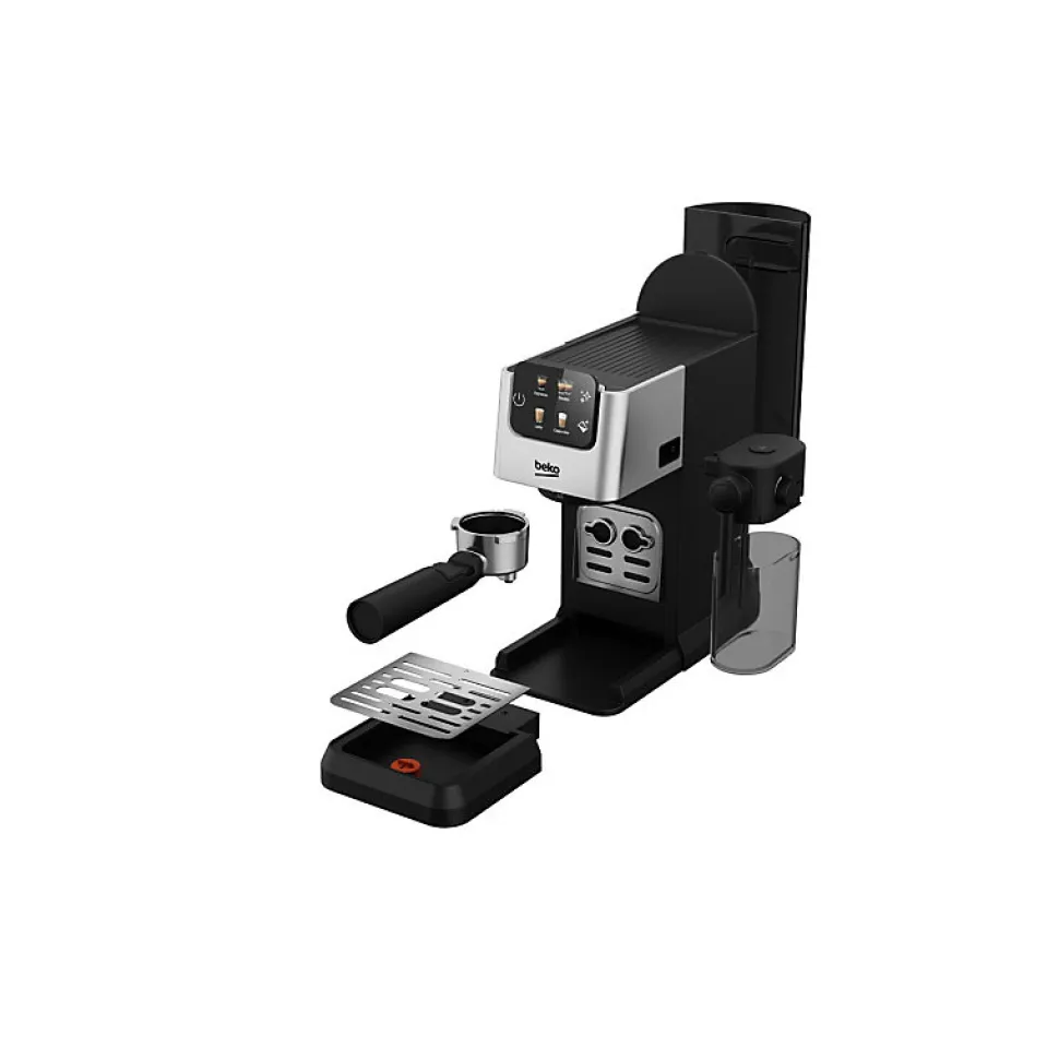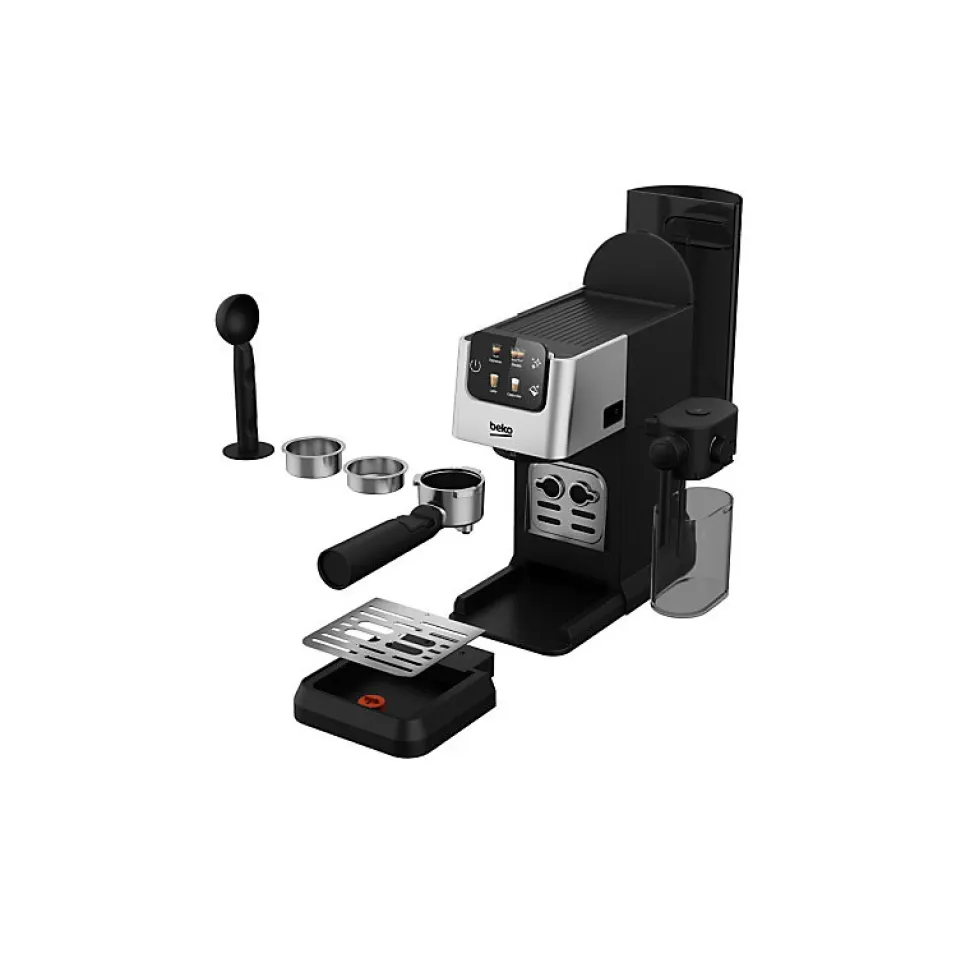 Machine expresso manuelle BEKO CEP5304X 15 bar avec carafe à lait intégrée 300 ml, réservoir amovible 1,1 L, écran tactile coloré et 4 recettes (expresso, double, cappuccino, latte). Plateau chauffe-tasses, bac récolte-goutte amovible et détartrage automatique pour un entretien facilité.