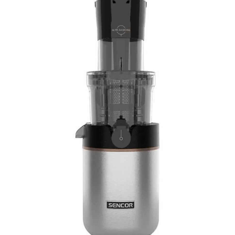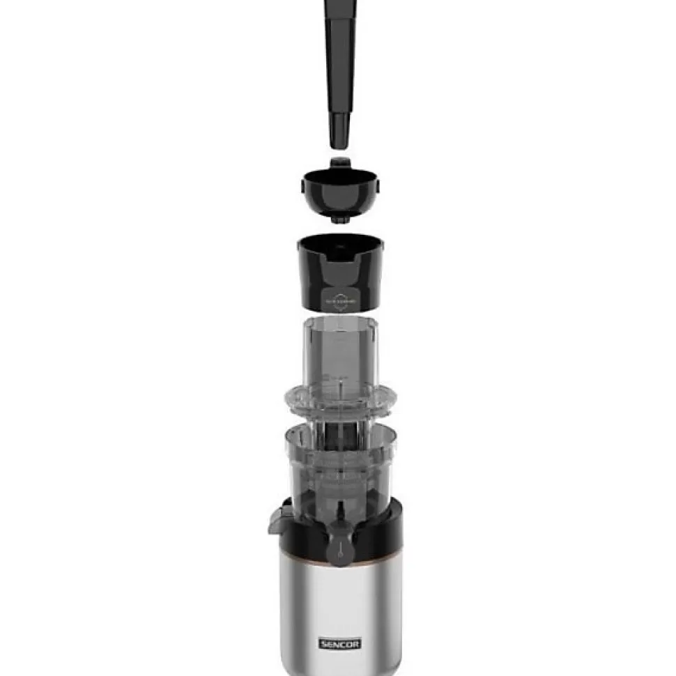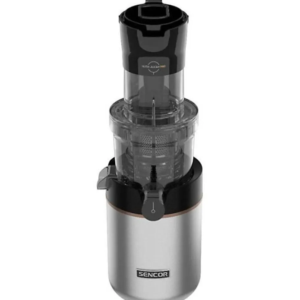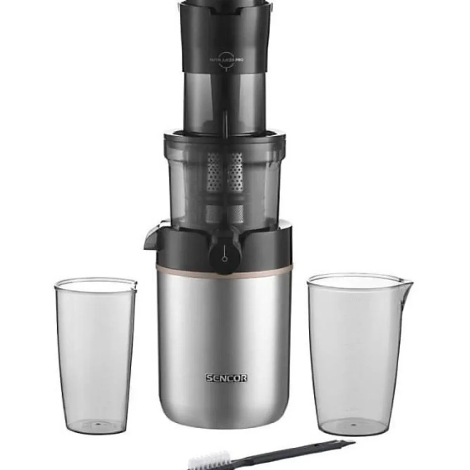 Extracteur de jus lent Sencor SSJ 8050 en acier inoxydable : moteur DC silencieux 200 W, tube d’alimentation large 78 mm, microfiltre inox pour un jus clair, capacité 800 ml jus et 600 ml pulpe, technologie DripStop anti-gouttes. Livré avec gobelet à jus, gobelet à pulpe, poussoir et brosse de nettoyage. Deux vitesses et entretien facile.