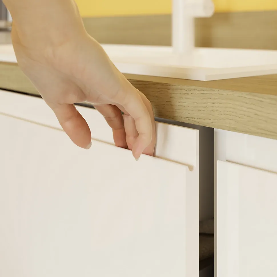 Notre gamme présente les dernières tendances en matière de styles, de couleurs et de finitions de porte. Le tout parfaitement coordonné avec notre gamme GoodHome pour la cuisine. Nos portes Garcinia ont un superbe aspect, avec des poignées intégrées, et sont idéales pour les petites cuisines. Disponibles en mat ou brillant, nous recommandons des portes brillantes pour les petits espaces, car elles reflètent la lumière dans la pièce. Les portes blanches feront de votre cuisine l’endroit idéal pour vous détendre après une longue journée.