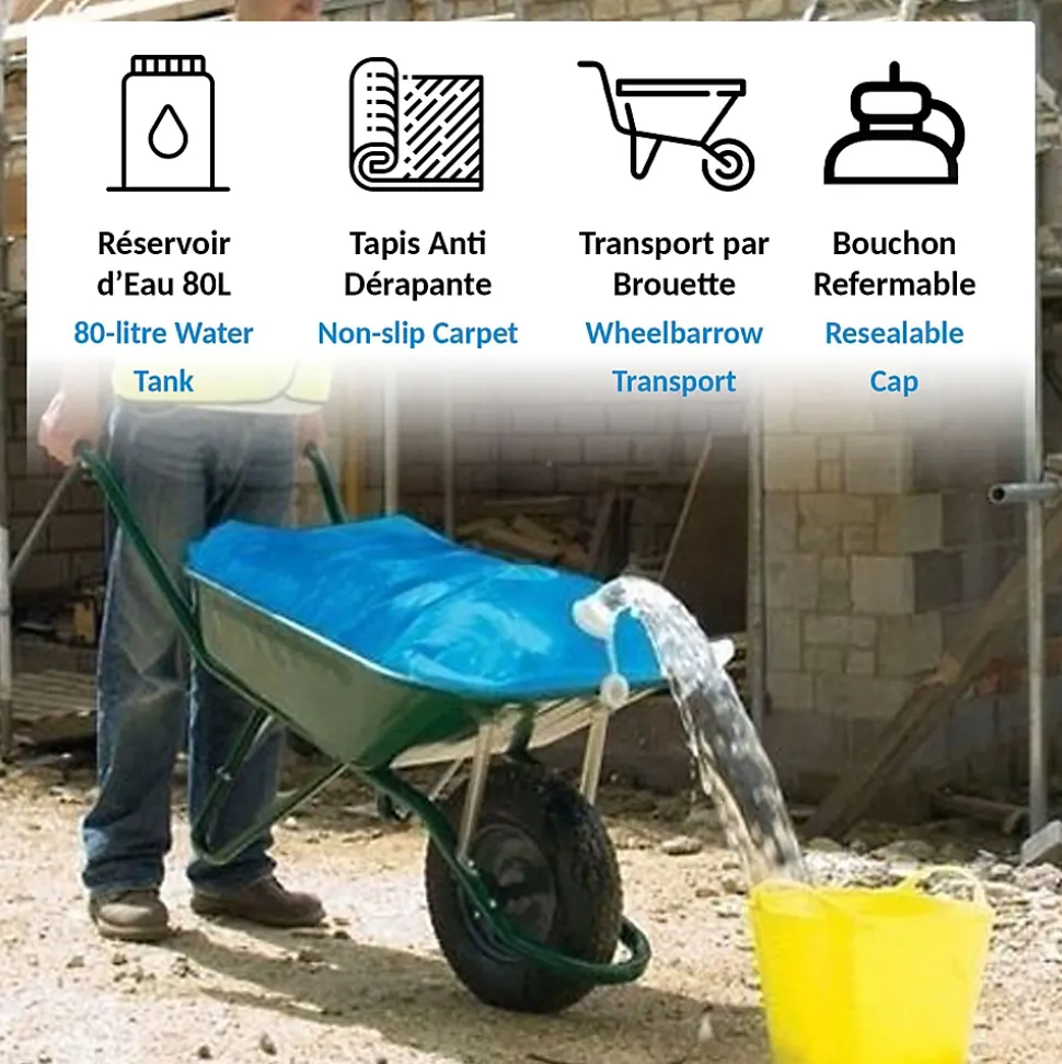 – PRATIQUE – La poche à eau vous permet de remplacer un tuyau d’arrosage. Cette poche ingénieuse a reçu le produit le plus innovant durant 3 ans (2008/9/10) – ASTUCIEUX – Ce Sac à eau vous servira en camping, dans votre jardin, pour abreuver vos animaux, sur des chantiers,… nombreuses sont les occasions où on a besoin d’eau loin d’un robinet. – RESISTANT – En plastique souple ultra résistant, et accompagné d’un tapis anti dérapant particulièrement pratique pour un transport dans votre brouette. – UTILISATION – Elle est même muni d’un embout pomme d’arrosage pour vos plantes. – CARACTERISTIQUES – Dimensions : 100 X 70 cm. Normes CE, GS. Garantie 2 ans.