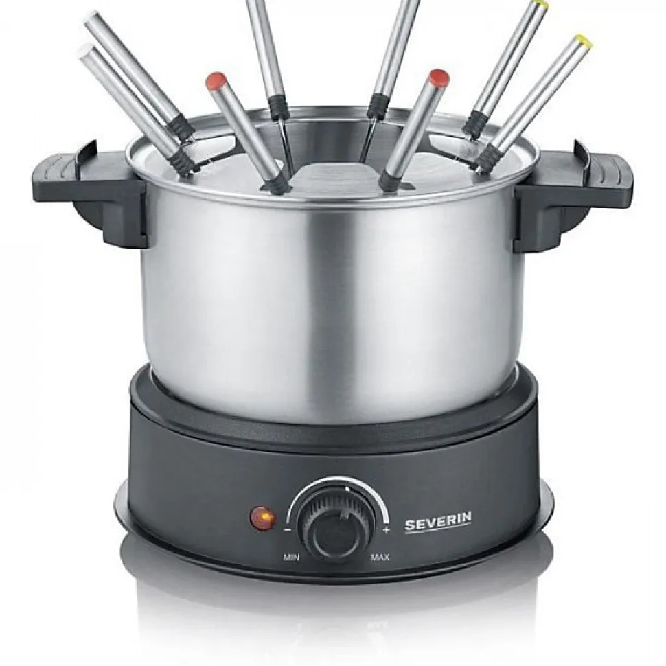 La fondue électrique SEVERIN FO2473 est idéale pour des soirées conviviales jusqu’a 8 personnes.Elle permet de réaliser des fondues savoyardes, bourguignonnes, chinoises ou au chocolat selon vos envies.Le caquelon inox amovible d’une capacité de 1,4 L est lavable au lave-vaisselle.La protection anti-projections avec fixations pour les fourchettes assure une utilisation en toute sécurité.