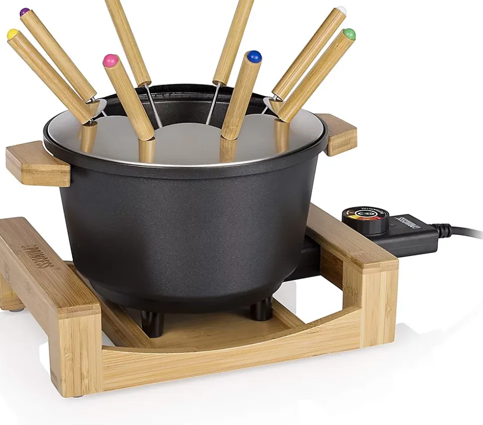 Préparez facilement des fondues bourguignonne, savoyarde, chinoise ou au chocolat avec cet appareil polyvalent pour 8 personnes. Le thermostat réglable permet de sélectionner la température idéale pour chaque type de fondue. Son caquelon en fonte d’aluminium de 1,5 L assure une diffusion homogène de la chaleur, tandis que le revêtement antiadhésif facilite le nettoyage. Les 8 fourchettes avec marqueurs de couleurs évitent toute confusion, et l’anneau intégré les maintient en place pendant l’utilisation. Avec sa puissance de 800 W, la fondue chauffe rapidement pour faire fondre le fromage ou le chocolat et cuire vos aliments en un rien de temps. Les poignées Cool Touch et les pieds antidérapants garantissent une utilisation sûre et stable, et l’appareil est garanti sans BPA. Les finitions en bambou ajoutent une touche élégante à votre table.