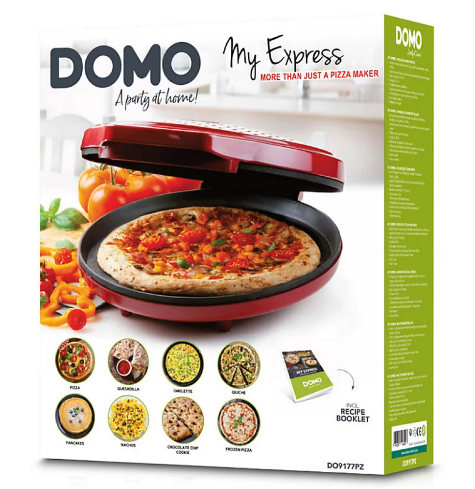 Four à pizza 1450w Domo – Le four à pizza My Express Domo DO9177PZ est un appareil de cuisine polyvalent pour préparer une pizza en 12 minutes. Idéal pour les pizzas fraîches, les pizzas surgelées, les omelettes, les crêpes, les quiches, les tortillas… Laissez l’appareil ouvert et utilisez la plaque inférieure comme plaque de cuisson. Doté de 2 éléments chauffants pour une bonne répartition de la chaleur. – Type de produit : Appareil pour pizza.Gamme : My Express.Type : Appareil à pizza.Puissance maximum (W) : 1450.Thermostat : Non.Divers : Revêtement anti-adhésif.Couleur : Rouge.Fonction(s) supplémentaire(s) : Utilisable en plaque de cuisson.Marche / Arrêt : Oui.Diamètre (cm) : 30.Accessoire(s) inclus : Livre de recettes.Facile à utiliser.Facile à nettoyer.