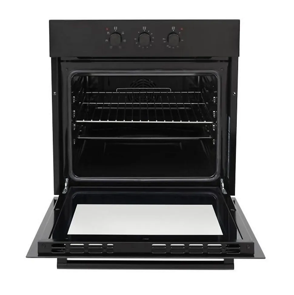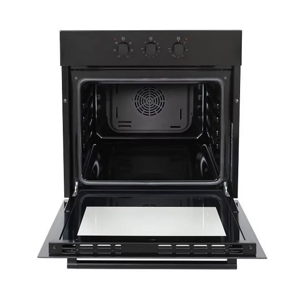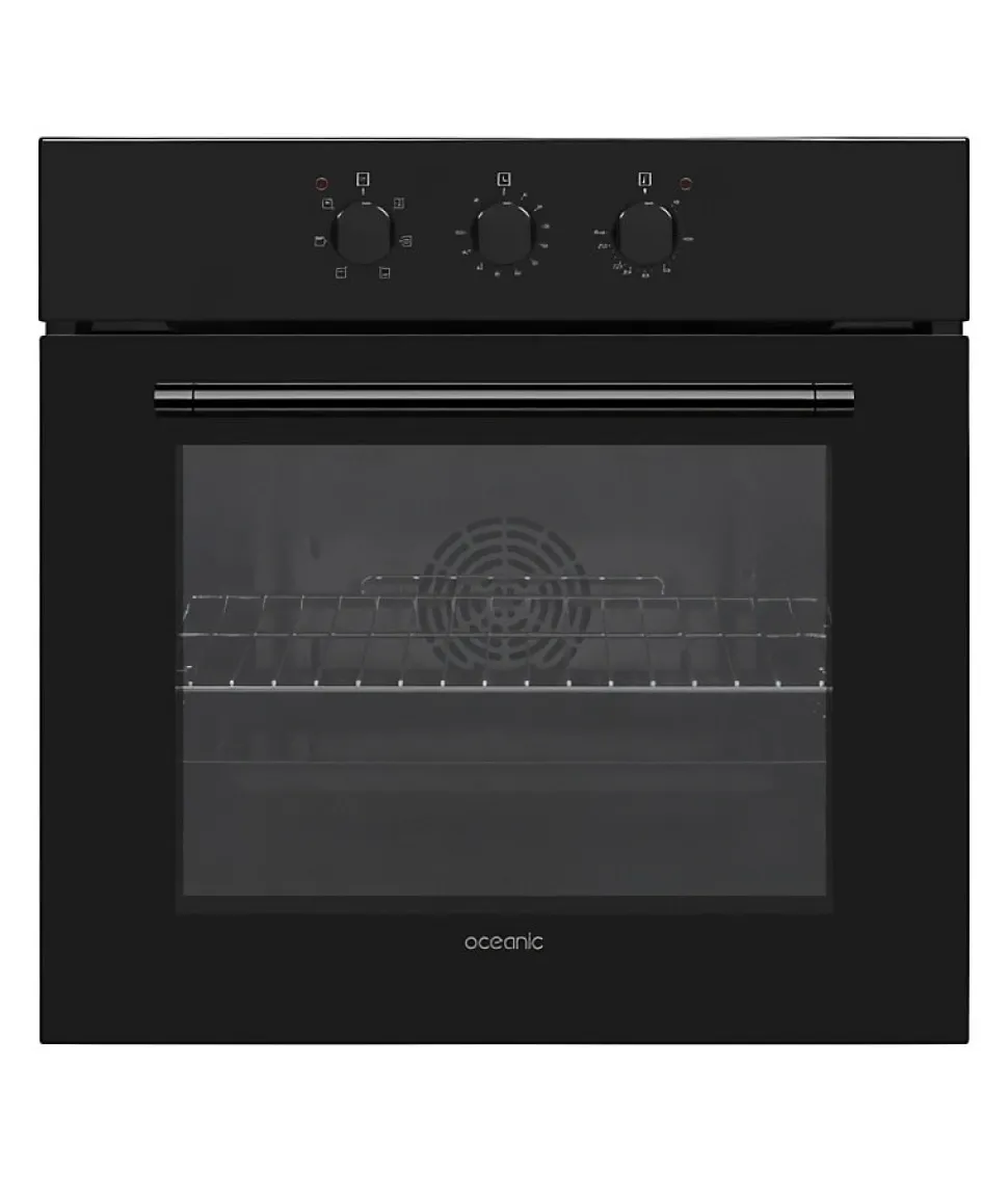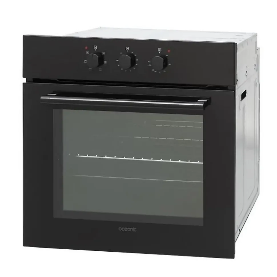 Four encastrable OCEANIC multifonction avec nettoyage catalyse, capacité 65L, chaleur tournante, classe énergétique A, design noir élégant, livré avec grille et lèchefrite, dimensions 59,5 cm (l) x 59,5 cm (h) x 57,5 cm (p), garantie 2 ans pièces, main d’oeuvre et déplacement.