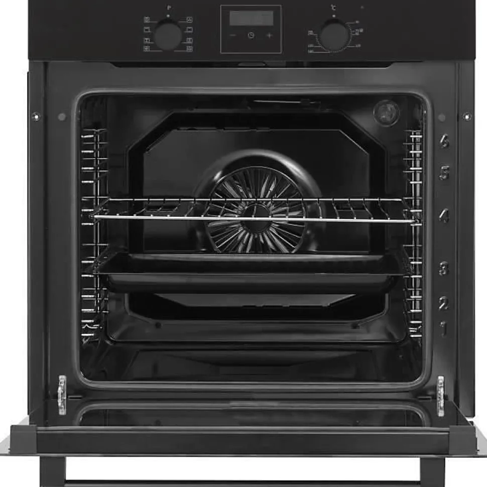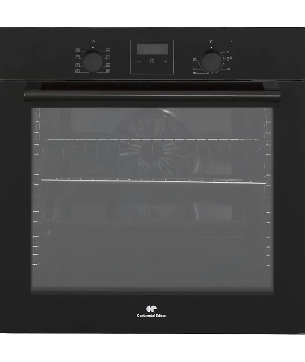 Four encastrable multifonction 80 L Continental Edison F80CBP noir avec catalyse, chaleur pulsée, programmateur digital et 8 modes de cuisson. Porte vitrée tempérée, éclairage intérieur, sécurité enfants et ventilateur de refroidissement. Puissance 2,5 kW, classe énergétique A.