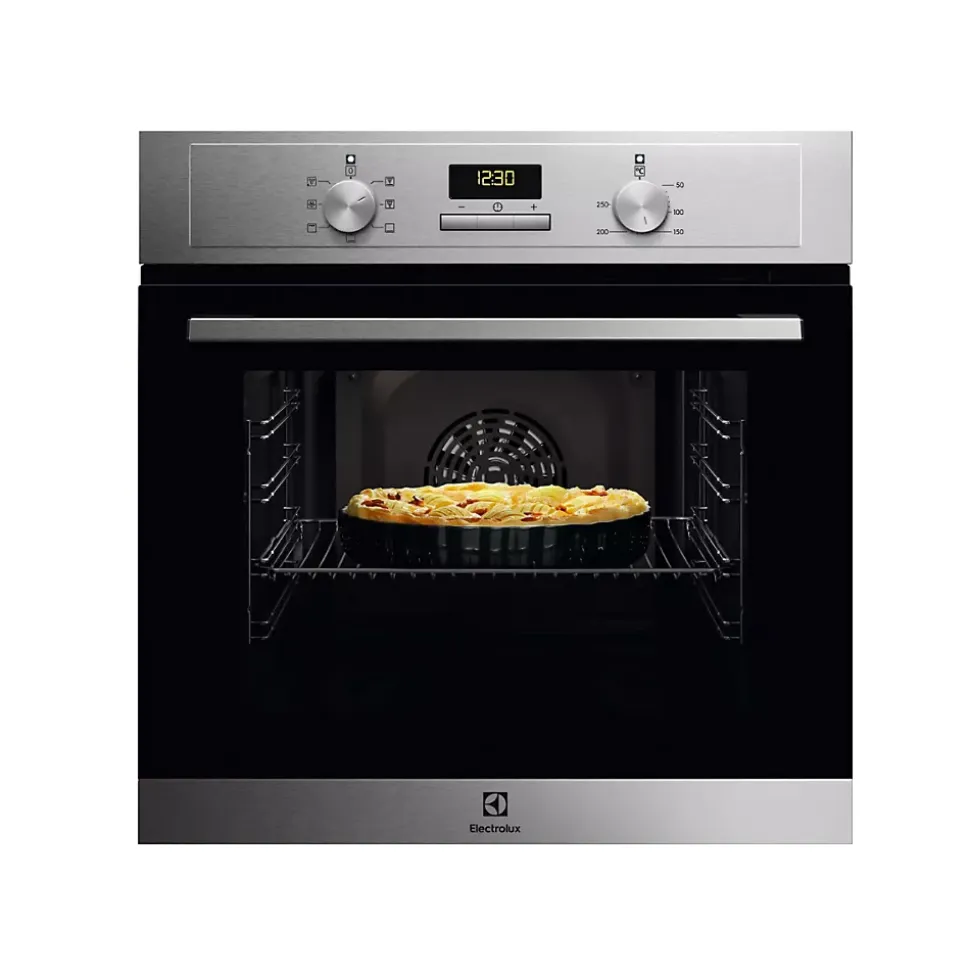 Four intégrable 65l 60cm catalyse inox Electrolux – Four intégrable multifonction Série 300 EOH3C01BX d’Electrolux.Une cuisson homogène pour des résultats surprenants :Le Four Série 300 chauffe plus rapidement qu’un four traditionnel. Le ventilateur répartit la chaleur à travers la cavité pour une cuisson rapide et homogène. Plus besoin de retourner vos plats pendant la cuisson.Cuisson uniforme, rapide et efficace :La chaleur tournante fait circuler l’air à travers le four assurant une cuisson homogène. Plus besoin de remuer ou de retourner votre plat. Une cuisson plus rapide pour un gain de temps et d’énergie.Pour un four auto-nettoyant, adoptez le nettoyage par catalyse :Dîtes adieu aux amas de graisse et résidus grâce au nettoyage par catalyse. La technologie de nettoyage automatique démarre dès lors que la température du four atteint 250°C. Nettoyer son four devient un jeu d’enfant.Des réglages précis avec notre affichage LED du minuteur :Il est facile de suivre la progression de la cuisson de vos plats grâce à l’affichage LED du minuteur. Vous pouvez facilement régler les temps de cuisson exacts et surveiller vos plats durant la cuisson. Cela vous offre un contrôle total sur le four, de façon à pouvoir dévoiler votre créativité culinaire.Pour des résultats vraiment dorés :Profitez plus que jamais de vos côtelettes ou de vos gratins grâce au gril. Idéal aussi pour vos ailes de poulets ou encore pour toutes vos pâtisseries.Un four éclairé pour une parfaite visibilité :Regardez la couche supérieure de vos lasagnes faire des bulles et dorer, la peau de votre poulet rôti devenir croustillante et cuite à la perfection. Grâce à l’éclairage bien positionné à l’intérieur du four, vous savez à quel moment vos plats sont les plus délicieux. – Type de produit : Four catalyse.Gamme : Série 300.Mode de cuisson : Multifonction.Nettoyage : Catalyse.Programmateur : Oui.Type de