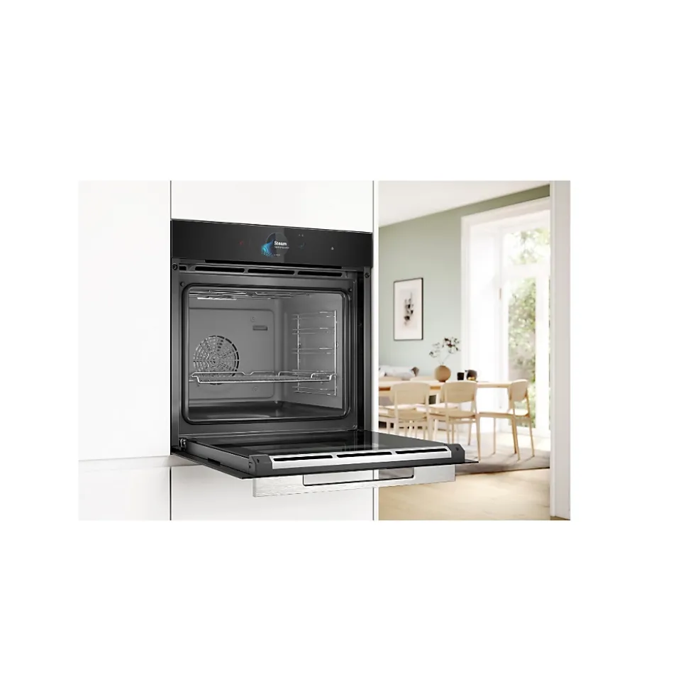 Four intégrable combi vapeur 71l 60cm a+ ecoclean noir Bosch – Four intégrable HSG7584B1 combi vapeur de Bosch. – Type de produit : Four intégrable combi vapeur.Puissance du raccordement électrique en watts : 3600.Évaluation actuelle de l’appareil : 16.Capacité : 71.Méthode de cuisson : Four ventilé.Type de carburant : Électrique.Minuteur : Oui.Programmes de recettes et/ou de cuisson automatique : Oui.Type de porte : Conventionnel.Charge totale connectée KW/W : 3.6.Type d’installation – Intégré/Construit sous : Soit.Méthode de nettoyage du four principal : Nettoyage facile.Classe énergétique : UN.Interface utilisateur : Écran tactile TFT avec bague de commande numérique.N° modes de chauffage : 23.Méthode de cuisson : 4D Air pulsé, Frire à l’air libre, Chaleur de sole, Chaleur sole-voûte, Chaleur sole-voûte douce, Décongélation, Déshydratation, fermentation, Gril pleine largeur, Gril demi-largeur, Air chaud doux, Griller air pulsé, Chaleur intense, cuisson basse température, Position pizza, préchauffage , Régénération, Vapeur 100%, réchauffement.Plage de température (°C) : 30-250 °C.Prise d’eau : Réservoir d’eau.Volume du réservoir d’eau : 1,0 litre.Système de nettoyage intégré : Catalytique tous côtés, Hydrolytique.Facilité d’accés : Accessoire.Charnière de porte : Fond, amorti.Volume utile (de cavité) – NOUVEAU (2010/30/CE) : 71 litres.Dispositif de sécurité : sécurité enfants, contacteur de porte, indicateur de chaleur résiduelle, fonction d’arrêt de sécurité du four, bouton de démarrage.Accessoires inclus : 1 x plaque à pâtisserie émaillée, 1 x grille, 1 x lèchefrite, 1 x récipient vapeur perforé taille XL, 1 x récipient vapeur perforé taille M, 1 x récipient vapeur non perforé taille M.Modes de chauffage combinables avec la fonction vapeur : Air chaud 4D, Chaleur conventionnelle, Griller à air chaud, Réchauffer.Couleur :