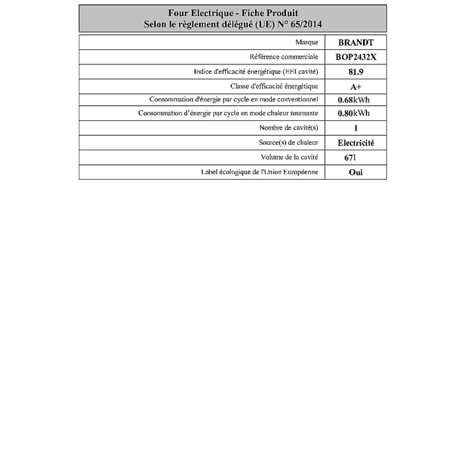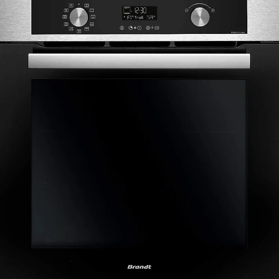 Four intégrable multifonction 67l 60cm pyrolyse inox Brandt – Four intégrable BOP2432X de Brandt permet de cuire simultanément sur plusieurs niveaux sans mélange d’odeurs. Il préconise la T° adaptée pour chaque fonction proposée. La cuisson vapeur permet de cuire vos aliments à plus basse température et donc de préserver leurs nutriments ainsi que votre santé, tout en rendant vos préparations toujours plus croustillantes. Préconisée pour la cuisson du pain, cette fonction permet d’obtenir une croûte croustillante et dorée. (T° préconisée 205°) – Type de produit : Four intégrable.Indice d’efficacité énergétique (EEI cavité entière) : 81.9.Classe d’efficacité énergétique cavité entière : A+.Consommation d’énergie cavité entière en mode conventionnel (kWh/cycle) : 0.68.Consommation d’énergie cavité entière en mode chaleur tournante (kWh/cycle) : 0.80.Nombre de cavités : 1.Source de chaleur par cavité : Electrique.Volume cavité entière (L) : 67.Mode de cuisson : Multifonction.Nettoyage : Pyrolyse.Programmateur : Oui.Connecté : NonPuissance totale (W) : 3385.Couleur : Inox.Couleur(s) secondaire(s) : Noir.Finition / Nuance : Inox.Gril : Oui.Type de gril : 4 niveaux, Ventilé.Puissance du gril (W) : 2 100.Traditionnel : Oui.Maintien au chaud : Oui.Pain : Oui.Autre(s) mode(s) de cuisson : Chaleur brassée, Sole ventilée, Eco.Préconisation de la T°C : Oui.Autre(s) fonction(s) : Guide culinaire 12 plats, Guide vapeur.Ouverture de la porte : Porte abattante.Porte froide : Oui.Revêtement de la cavité : Emaillé.Sonde à viande : Non.Autres : Gradins emboutis.Accessoire(s) inclus : 1 grille plate sécurité, 1 plat 8 mm, 1 plat 48 mm.Ecran : Oui.Type d’affichage : LCD.Autre(s) sécurité(s) : Auto stop système, Verrouillage de l’accès au bandeau.Dim. H x L x P (cm) : 59.2 x 59.2 x 60.8.Encastrement H x L x P