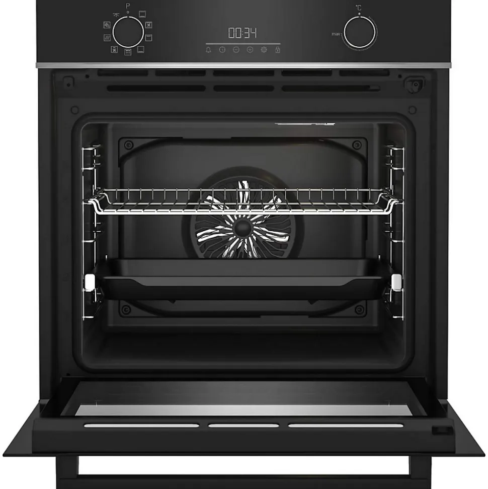 Four intégrable multifonction 72l 60cm pyrolyse noir Beko – Ce four vous garantit une cuisson économique grâce à la classe énergétique A. Grâce au système de fermeture douce, comme pour vos meubles de cuisine, votre porte se referme avec délicatesse à chaque utilisation. Le rail télescopique permet un accès simplifié et sécurisé aux plats.Il est désormais très facile d’enfourner et de retirer ses plats du four ! Porte froide Gifam : Evitez tout risque de brûlure, même en pyrolyse. Grâce à ses quatre vitres, la porte froide reste à faible température, même en mode pyrolyse lorsque le four atteint 480°C. Idéale lorsque vous avez des enfants en bas âge. En activant le nettoyage par pyrolyse, la température du four est portée à 480°C sur une durée de 2 heures, éliminant ainsi toutes les salissures. – Type de produit : Four intégrable multifonction.Indice d’efficacité énergétique (EEI cavité entière) : 95.3.Classe d’efficacité énergétique cavité entière : A.Conso. énergie cavité entière mode conventionnel (kWh/cycle) : 0.99.Conso. énergie cavité entière mode chaleur tournante (kWh/cycle) : 0.81.Nombre de cavités : 1.Source de chaleur par cavité : Electrique.Volume cavité entière (L) : 72.Type : Four pyrolyse.Mode de cuisson : Multifonction.Nettoyage : Pyrolyse.Programmateur : Oui.Connecté : Non.Puissance totale (W) : 2600.Régulation de la T°C : Mécanique.Finition / Nuance : Verre.Nbre de modes de cuisson : 9.Convection naturelle : Oui.Gril : Oui.Type de gril : Gril fort, Gril doux ventilé.Décongélation : Oui.Maintien au chaud : Oui.Autre(s) mode(s) de cuisson : Chaleur brassée, Sole.Autre(s) fonction(s) : Nettoyage vapeur.Type de porte : Fermeture douce.Ouverture de la porte : Porte abattante.Porte froide : Oui.Contre porte plein verre : Oui.Nbre de vitre(s) : 4.Touches sensitives : Oui.Type de bandeau de commande :