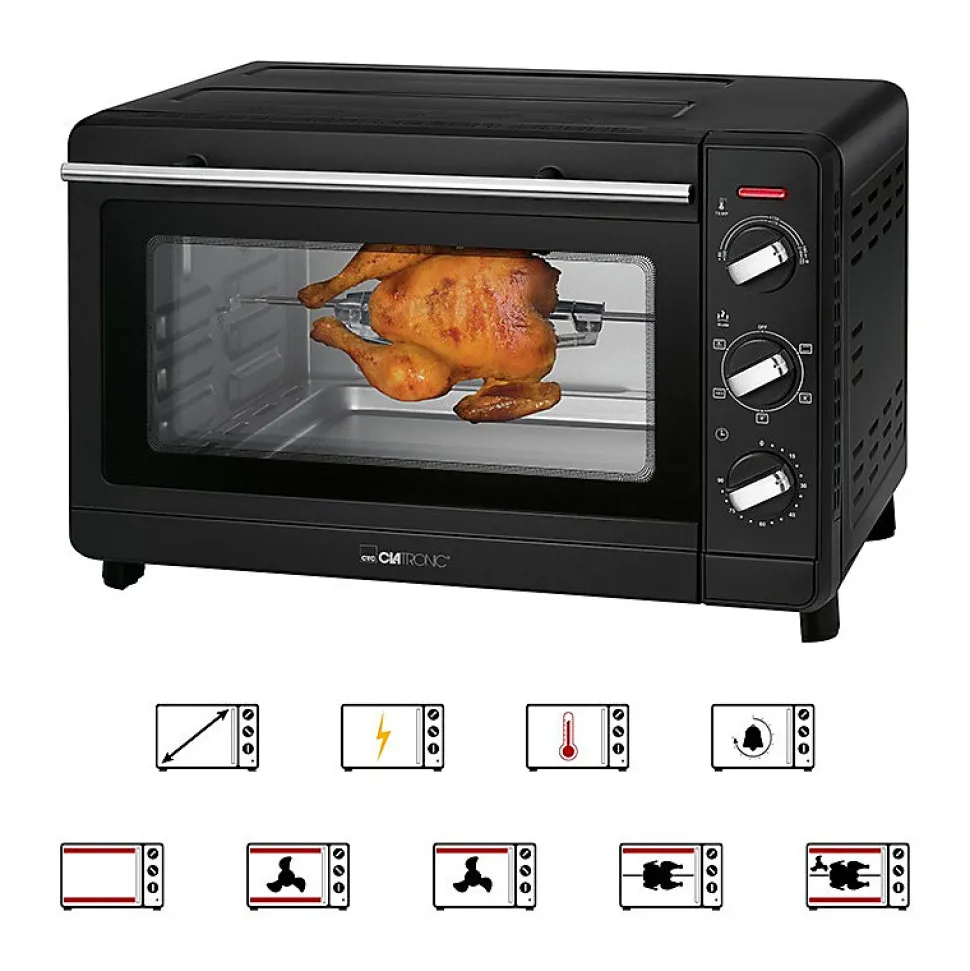 Capacité du four de 30 litresConvectionChaleur supérieure et inférieure (fonctionnement combiné)Broche tournantePierre à pizza (Ø 29 cm)Minuterie de 90 minutes avec signal de fin de cuissonInterrupteurs à 6 niveaux :- Chaleur supérieure et inférieure- Chaleur supérieure et inférieure + convection- Chaleur supérieure + convection- Chaleur supérieure + broche tournante- Chaleur supérieure et inférieure + broche tournante + convection- ArrêtRéglage progressif de la température (100°C-230°C)Voyant lumineuxPorte à double vitrage avec poignée en acier inoxydableTiroir ramasse-miettes amovibleGrille de cuisson, plaque de cuisson, broche tournante et pierre à pizza (Ø 29 cm) incluses.Pince pour retirer la grille et la plaque de cuisson, outil pour retirer la broche tournante, etc.pour retirer la broche tournanteGrande fenêtre de visualisation220-240 V, 50/60 Hz, 1500 W