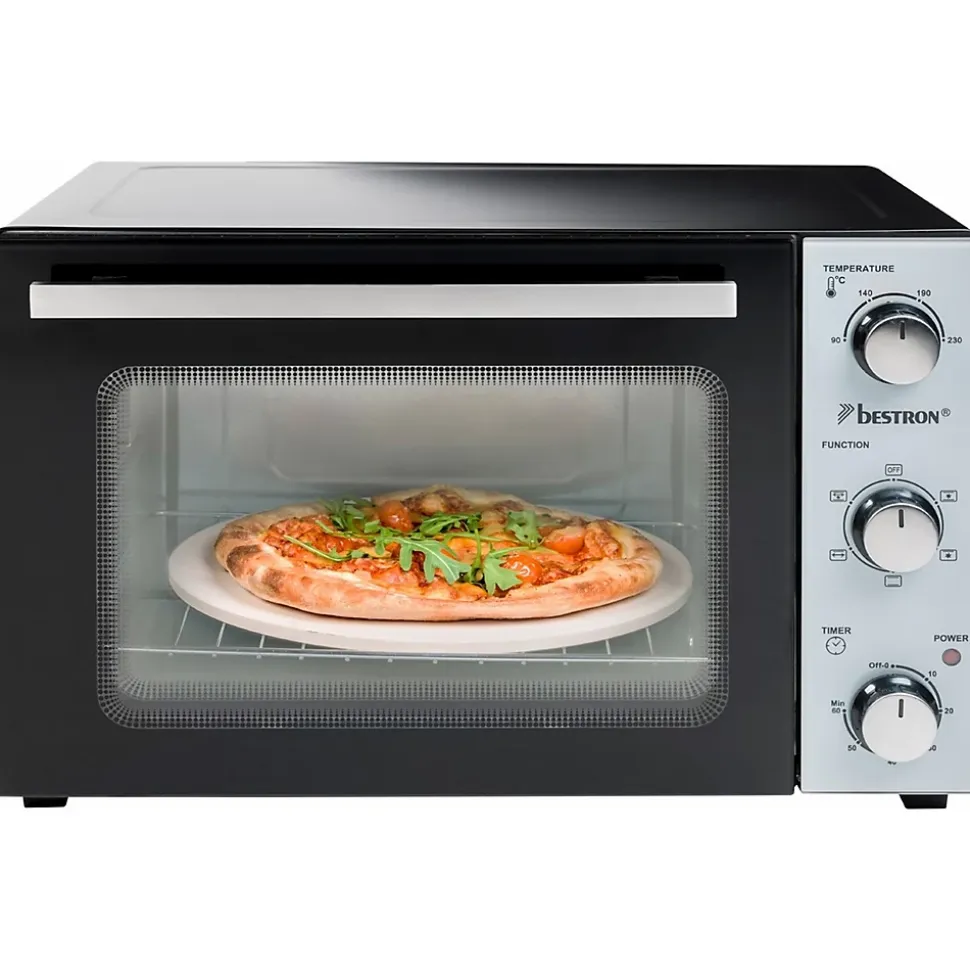 Four multifonction 31l 1500w Bestron – Avec une puissance de 1 500 W, une température réglable jusqu’à 230 ° C et une circulation d’air chaud, le four à gril AOV31PS de la marque Bestron est un four électrique fiable ainsi qu’une rôtissoire pratique pour la viande et la volaille.Il est également idéal pour les grillades, cuisiner et griller de délicieux plats en un rien de temps !La fonction de rôtissoire est pratique lorsque vous souhaitez préparer un poulet croustillant et savoureux à la maison. – Puissance : 1500 WEspace de four environ 31 litres, avec éclairage intérieurBoîtier bien isolé pour une faible chaleur de surfacePorte en verre à double paroi avec poignée thermorésistante et 3 positions de porteTempérature réglable jusqu’à 230°CInterrupteur à 6 positions pour:- Chaleur supérieure + Chaleur inférieure + Air chaud- Chaleur supérieure + Air chaud- Chaleur supérieure + Chaleur inférieure- Chaleur supérieure + Rôtisserie- Chaleur supérieure + Chaleur inférieure + Air chaud + Rôtisserie- Off (désactivé)Minuterie de 60 minutes avec signal de fin, s’éteint automatiquementVoyant lumineux4 éléments de chaleur en acier inoxydableAvec une pierre à pizza (diamètre 30,5 cm) pour une cuisson authentique de pizzas croustillantesRôtisserie pratique pour la viande et la volailleAvec grille de gril, plaque de cuisson émaillée et poignée de retrait pratique3 hauteurs de grille différentesFacile à nettoyerDimensions intérieures (L x P x H) : 36 x 33 x 26 cmDimensions extérieures (L x P x H) : 51 x 40 x 33,5 cmPoids : 11.18 kg