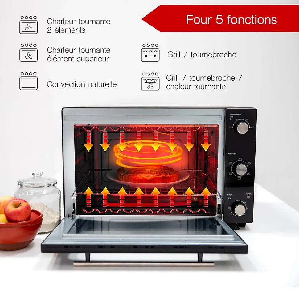 Four multifonction chaleur tournante 58l 2000w noir Kitchen Move – Four multifonction 58L chaleur tournante tournebroche grill 2000w ARIZONA noir 5 programmes de cuisson avec minuterie et accessoiresLe four électrique offre différents modes de cuisson : convection naturelle (chauffe de façon verticale) et chaleur tournante (un ventilateur répartit uniformément la chaleur à l’intérieur du four pour une répartition homogène et rapide de la chaleur).Vous pourrez également sélectionner la fonction grill pour faire gratiner vos plats et la fonction rôtissoire pour de jolis poulets rôtis ! (livré avec le tournebroche spécial rôtisserie).Grâce à ce four, vous pouvez cuisiner tous les types de recettes que vous souhaitez : entrées, viandes, poissons, frites, petits pains précuits, gâteaux, pizzas, gratins, desserts, quiches, saucisses, côtelettes.. – Four posablePuissance : 2000 WCapacité : 58 LThermostat réglable de 100 à 230 °CMinuteur de 0 à 60 minutes avec arrêt automatique et sonnerie en fin de cuissonPorte double vitrage haute résistanceCavité anti-adhésive pour un nettoyage aiséPoignée et boutons rotatifs en acier inoxydable4 pieds anti-dérapants pour un support plus stableAccessoires : grille, lèchefrite, tournebroche et poignées (1 poignée pour le tournebroche et 1 poignée pour la plaque/lèchefrite)Dimensions : 60 x 47 x H39 cmPoids : 13.3 kg