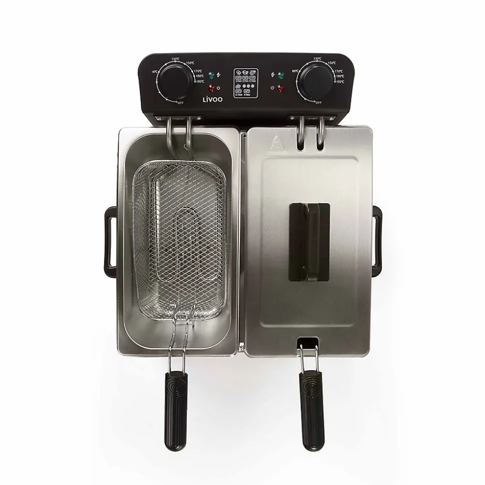 Friteuse double 2x3l 3300w inox Livoo – Très simple d’utilisation la friteuse double DOC217 de Livoo est entièrement démontable pour un entretien facile.Elle dispose d’un système thermofusible de sécurité réenclenchable – Friteuse doublePuissance : 3300 WCorps en acier inoxydable chroméLarge capacité de 2 x 3 LJusqu’à 1,6 kg de fritesEntièrement démontable pour un entretien facile2 thermostats indépendants et réglables jusqu’à 190°CCuve à revêtement émailléPanier à friture à position haute pour égouttage avec poignées amovibles et repliablesTémoins lumineux de marche et de chauffeProtection contre la surchauffeCompartiment de rangement pour câble électrique4 pieds antidérapants et poignées de transportDimensions : 40 x 40 x 22,5 cm