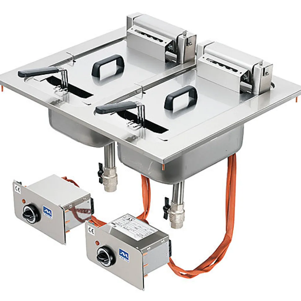 friteuse électrique 10 litres friteuse électrique 10 litres Friteuse électrique avec plan de travail et cuve en acier inoxydable AISI 304. Capacité du puits : 10 litres. Équipé d’un robinet de vidange. Équipé d’éléments chauffants renforcés inclinables pour faciliter le nettoyage et d’une température contrôlée par un thermostat réglable de 100° à 190°C. Tous les modèles sont équipés d’un interrupteur principal, d’un thermostat de sécurité et d’un indicateur LED indiquant le bon fonctionnement.Caractéristiques techniques :Dimensions (mm) : L400 P650Poids (kg) : 20,7Énergie : ÉlectricitéTension (V) : 400Fréq. : 50/60Phase : 3F+NPuissance (kW) : 7,5 Gris – l40- L0.1- P65- h0.1- Acier Inoxydable