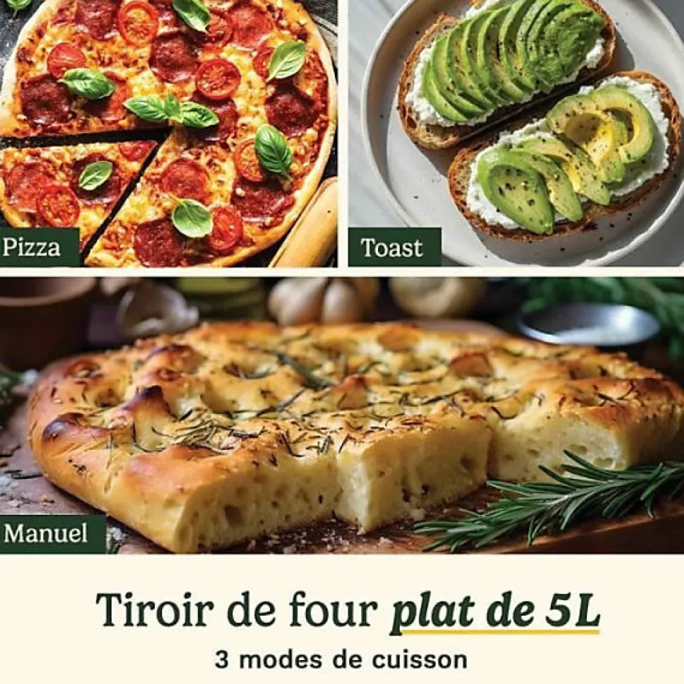 - Intérieur revêtu de céramique sans PFAS pour une cuisson plus saine et multiples modes préprogrammés (Pizza, Toast, Manuel) et fonctions Air fry/Grill/Roast/Bake/Dehydrate/Reheat.