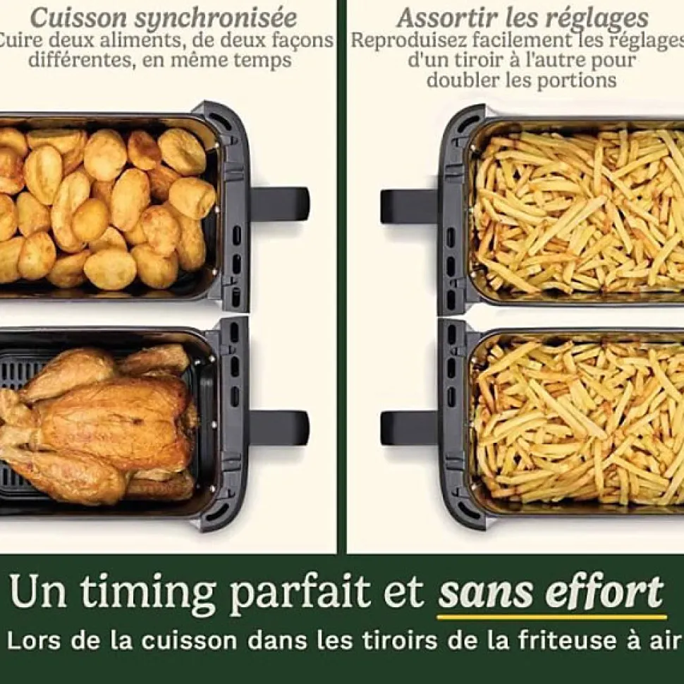 Cuisinart Trizone AFT13XSSE : airfryer 3 zones indépendantes (2 paniers 4,3 L + tiroir 5 L) pour cuire plusieurs plats simultanément, 13,6 L, 2400 W, revêtement céramique sans PFAS, panneau tactile, modes programmés (Pizza, Toast, Manuel) et nettoyage facile.