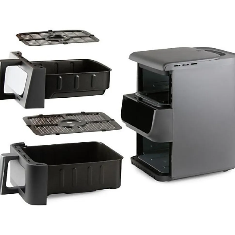 Friteuse sans huile DOMO Airfryer DO550FR, design vertical 2 tiroirs empilés (économise 30% d’espace), double cuve 10 L (3,5 + 6,5 L), 10 programmes, 2500 W, température 80–200°C, minuterie jusqu’à 60 min, écran LED tactile, paniers et grilles antiadhésif sans PFAS, hublots de contrôle, poignées Cool Touch.