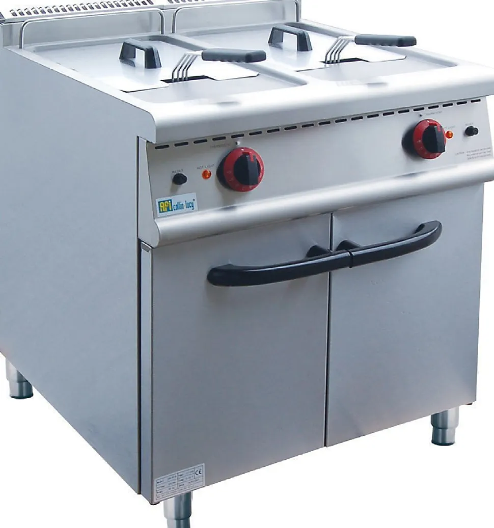 AFI Collin-Lucy friteuse Friteuse électrique sur coffre de la gamme Top 700 comprenant deux cuves de 20 litres chacune. Cette friteuse professionnelle sur meuble est fabriquée en acier inoxydable. Elle est équipée d’une lampe témoin de chauffe, d’un thermostat de sécurité et de 3 résistances par cuve. Tension: Tri 400 VLivrées avec 1 panier par cuve (325 x 230 x 140 mm)Volume (litres): 2 x 20Puissance (kW): 24Poids (kg): 107Largeur: 700 mmProfondeur: 700 mmHauteur: 850 mm.
