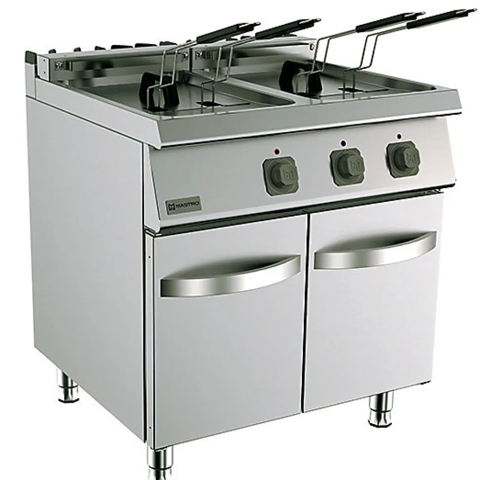 Friteuse électrique sur soubassement fermé, 2x 18 litres Bac double. Grillade cheminée en fonte émaillée inrayable. Friteuse avec armoire de rangement. Contrôle de la température par thermostat. Paniers en acier inoxydable. Température réglable. Brûleurs tubulaires en acier inoxydable. Facile à nettoyer grâce aux éléments chauffants mobiles. Thermostat de sécurité (190°C) pour éviter la surchauffe de l’huile.