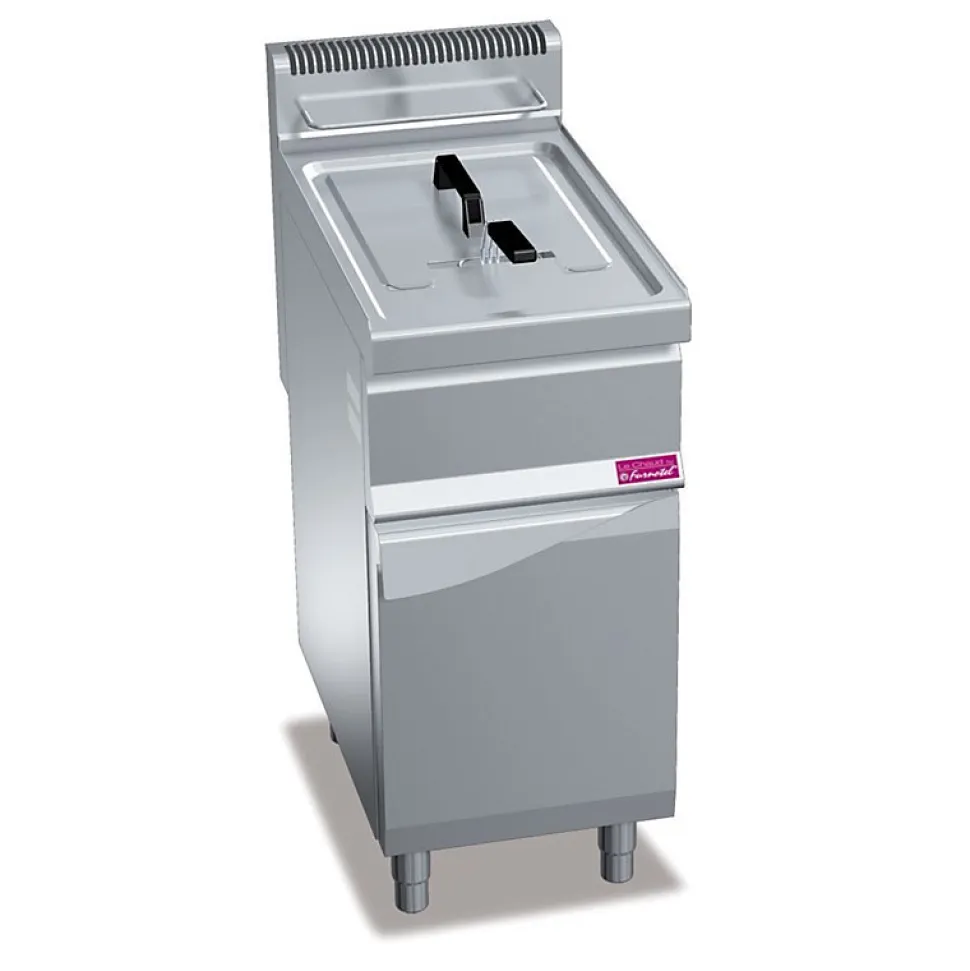 Friteuse gaz sur coffre Furnotel Cette friteuse gaz sur coffre dispose d’une façade en acier inoxydable AISI 304, de poignées ergonomiques d’épaisseur 20/10ème, d’un système de sécurité avec thermocouple, d’un thermostat de sécurité et flamme pilote protégée. Le temps moyen de friture est de 5 minutes et le préchauffage dure 10 minutes (de 20 à 190°C). Cette friteuse gaz sur coffre FURNOTEL est équipée d’un allumage piézomécanique avec protection en silicone, de pieds réglables en hauteur.Largeur : 400 mmProfondeur : 700 mmHauteur : 900 mmPoids : 35 kgPuissance : 12700 WCapacité de la cuve : 15 LCapacité maximale : 18 kg / hDimensions panier (L x P x H) : 300 x 245 x 115 mmType d’appareil : Friteuse sur coffre