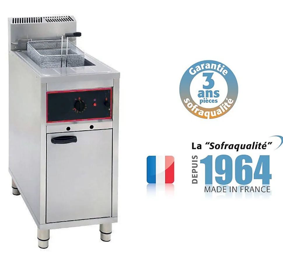 Friteuse gaz sur coffre – 16 Litres – 7 kW – SofracaCette friteuse gaz sur coffre est spécialement conçue pour les professionnelles de la restauration et convient aux besoins des fast-foods et des établissements à grand débit, avec un rendement de 30 kg de frites/heure.La cuve est isolée avec marquage mini/maxi du niveau d’huile, fournie avec un seau de vidange. La vidange se fait en toute sécurité dans le coffre de la friteuse, grâce à sa cuve emboutie à fond incliné. Cela permet qu’il n’y est aucun résidu d’huile.Capacité cuve : 16 LitresAlimentation : Gaz Butane/PropanePuissance : 14000 WRendement : 30 kg frites/h La friteuse sur coffre FG16 est équipée d’un allumage facile par Piezo (pression simultanée des boutons d’allumage et de réglage) avec contrôle de l’allumage de la veilleuse, d’une cuve emboutie de 16 litres avec 1 grand panier de 250 x 300 x 145 mm, de 2 brûleurs placés sous la cuve, d’un bouton de régulation petite ou grande flamme, d’un couvercle tout inox et d’un support panier filtrant pour les résidus importants, pour la friture de beignets ou la friture de grosses pièces sans utilisation du panier.Le dosseret arrière permet une évacuation directe des gaz. Les pieds sont réglables jusqu’à 150 mm avec possibilité de fixation au sol selon les normes CE-UL/NSF.Livrée avec un jeu d’injecteurs de rechange gaz naturel.