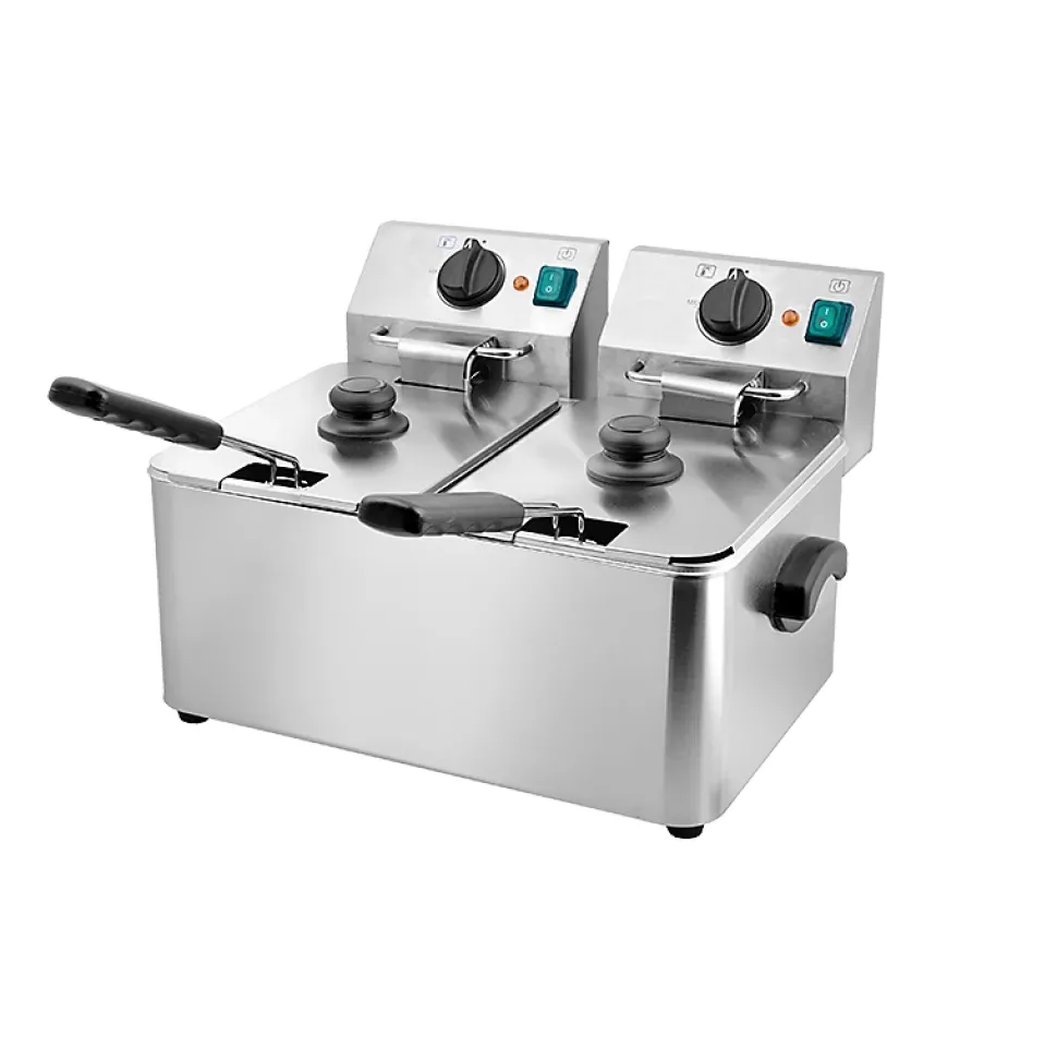Friteuse Professionnelle 2 x 4 L Découvrez la Friteuse Professionnelle Dynasteel, l’option privilégiée des experts de la restauration à la recherche d’efficacité et de performance dans leur cuisine. Conçue pour répondre aux exigences élevées, elle dispose de deux cuves de 4 litres chacune, offrant ainsi une capacité double pour gérer simultanément différentes fritures ou doubler la production d’un même produit, optimisant ainsi le temps et la productivité en cuisine. Fabriquée en acier inoxydable, cette friteuse garantit une durabilité exceptionnelle et une résistance supérieure aux conditions difficiles des cuisines professionnelles. Son design élégant et sa finition impeccable s’intègrent parfaitement dans tout environnement, tout en facilitant le nettoyage et la maintenance grâce à sa surface lisse et non poreuse. Avec un système de chauffage puissant et une alimentation de 220-240 V pour une puissance de 2500 watts par cuve, cette friteuse permet une montée en température rapide et une récupération efficace de la chaleur, réduisant ainsi les délais et augmentant le rendement. Malgré l’absence d’une vanne de vidange, sa facilité d’utilisation et sa performance globale en font un atout majeur pour tout professionnel souhaitant maximiser l’efficacité de sa cuisine tout en garantissant la qualité et le goût des aliments préparés. Avec ses dimensions réfléchies de 548 mm de longueur, 494 mm de profondeur et 306 mm de hauteur, elle peut être installée facilement dans les espaces les plus restreints.