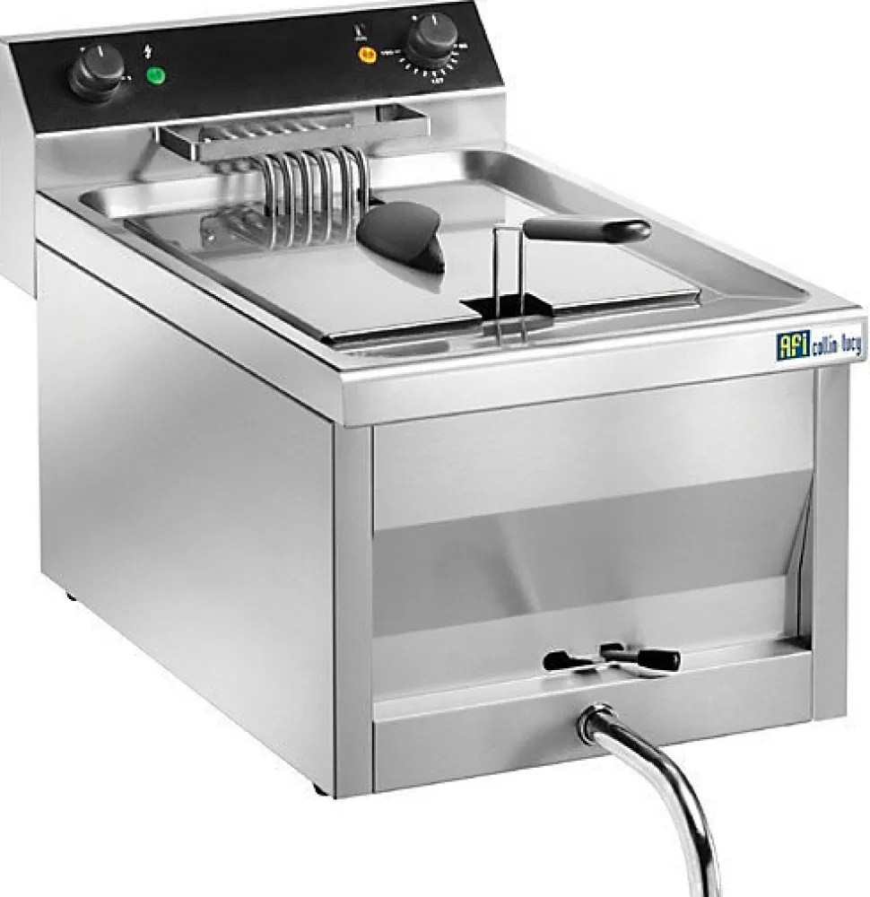 Friteuse professionnelle AFI Collin-Lucy Friteuse électrique professionnelle à poser construite tout en acier inoxydable. Equipée d’une cuve de 12 litres, cette friteuse dispose d’un robinet de vidange, d’un relais de puissance et d’une cuve emboutie et résistante amovible pour un entretien facile. Equipée d’un thermostat de sécurité à réarmement manuel et d’un contrôle thermostatique, cette friteuse à poser comprend également des témoins lumineux de fonctionnement. Thermostat gradué de 0°C à 190°CTension: Tri 400 VVolume (litres): 12Puissance (kW): 9Dim. panier (mm) : 230 x 280 x 120Dim. cuve (mm) : 240 x 360 x 240Largeur: 400 mmProfondeur: 700 mmHauteur: 320 mm.