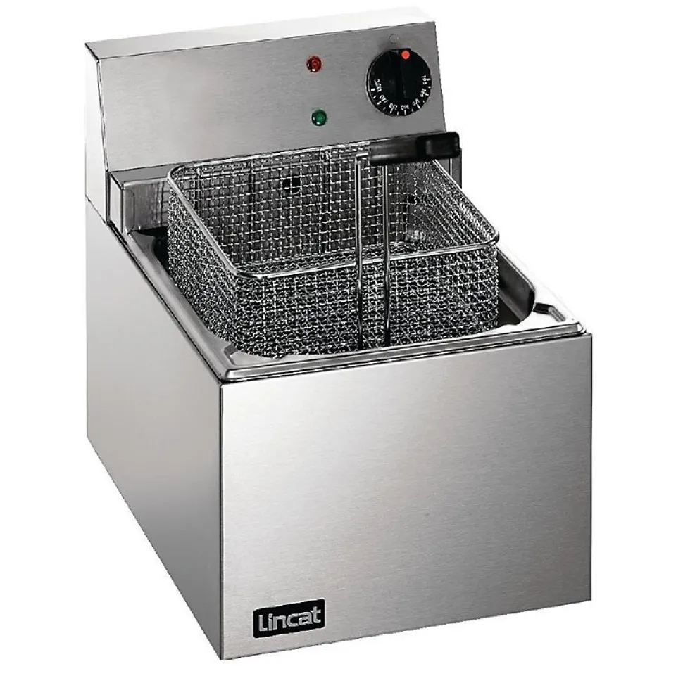 Friteuse Professionelle CHR Lynx Marque: LincatCapacité: 4 LDimensions: 315(H) x 270(L) x 417(P) mmDimensions – Bac: 85(H) x 190(L) x 208(P)mmMatériel: InoxRendement: 8 kg de frites surgelées / heure, 11 kg de frites fraîches / heurePuissance: 3kWCode du Fournisseur: LDFPlage de Température: 130 °C à 190 °CAlimentation: 230VPoids: 8 kgPrise: ouiPanneau de commande et résistances amovibles pour un nettoyage facileContrôle thermostatique pour une cuisson parfaiteCuve et plaque de fond inox amovibles pour un nettoyage facileThermostat de limite supérieure pour plus de sécurité (coupe la friteuse en cas de panne du thermostat de contrôle)Plaque de fond, couvercle inox et panier robuste fournis de sérieAppareil prêt à brancher, pas d’installation nécessaire