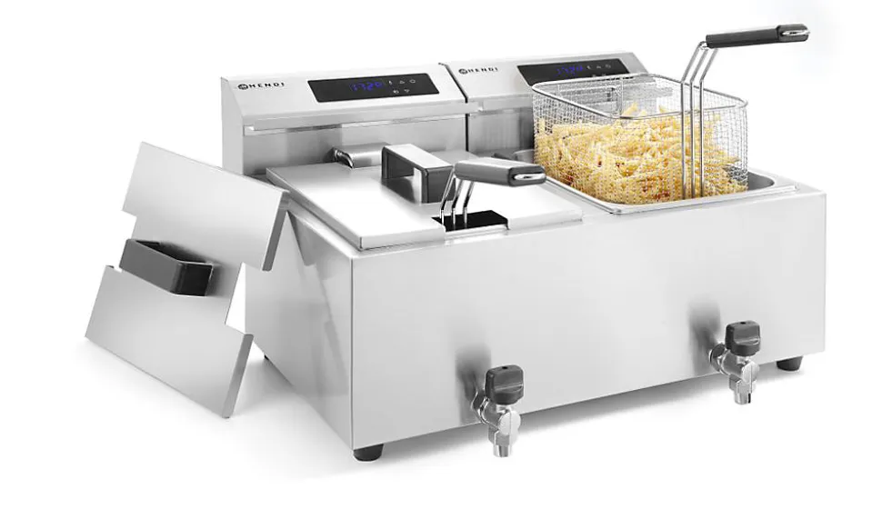 Friteuse Professionnelle Profi Line avec robinet de vidange numérique Friteuse Professionnelle Profi Line avec robinet de vidange numérique Les friteuses de table de la gamme Profi Line sont fabriquées en acier inoxydable 18/0. Elles sont équipées d’un élément chauffant amovible qui s’arrête automatiquement lorsqu’il est enlevé de l’appareil. La cuve à huile en forme V pour une meilleure zone froide et prolonge la longévité de L’huile. Panneau de commande numérique avec fonction température et minuteur. Protection contre la surchauffe par un fusible thermique avec fonction reset. Un panier à friture avec manche extra-long en fait un modèle idéal pour L’utilisation intensive. Toutes les friteuses comprennent panier(s) à friture et couvercle(s).Panneau de commande numérique avec fonction température et minuteur. l51.5- L0.1- P60.5- h34.5- Inox